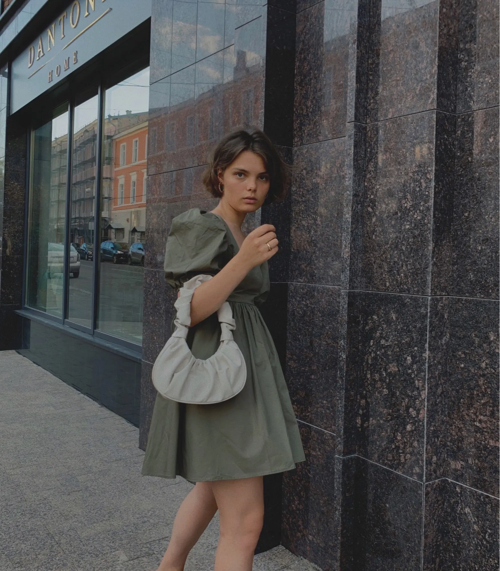 Very rarely I write reviews, but this dress is above all praise! The color is green, very pleasant, the material is not clear, but also pleasant and dense (it is difficult to iron only), the dress keeps the shape precisely because of the rigiof the The size of M-Ka approached, it was possible to take L-ku, because to my height 174 it is quite short, literally on the verge. I wear it and really like it!