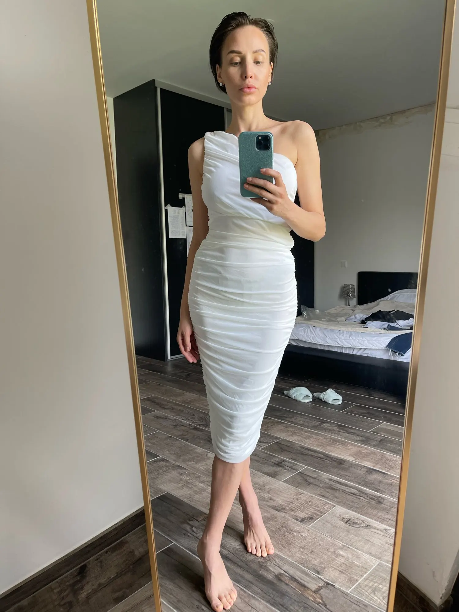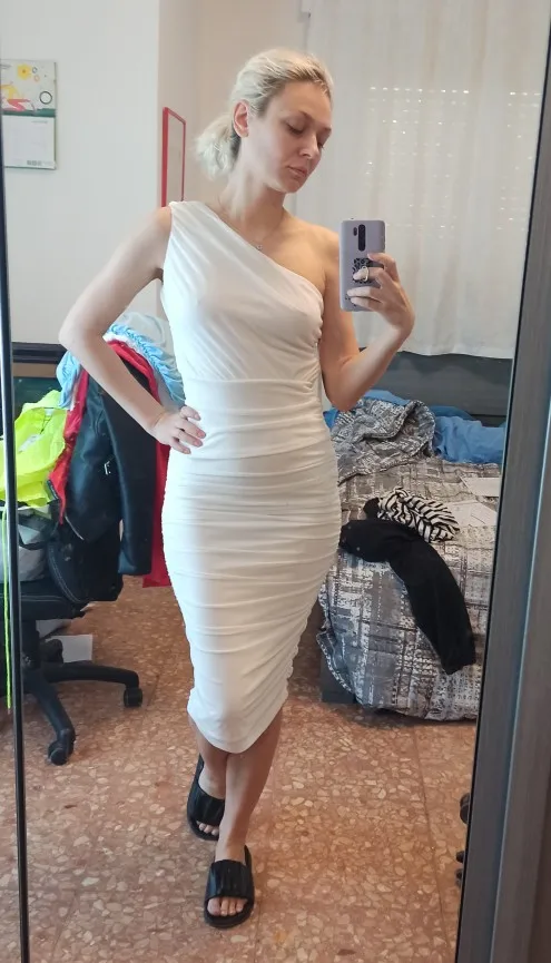 Gorgeous dress! Ordered size s for my 92-62-92, in the chest and waist a little loose, but because of the creases it is invisible. Very pleasant to the body and soft. I will remove the length, I want a little shorter. On my height 167 dress 20 cm below the knee. Looks very expensive. The thread does not stick out. Delivery ahead of time!!!