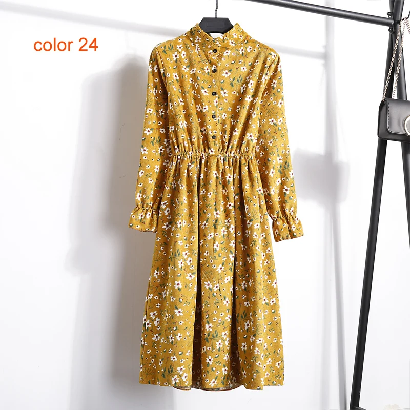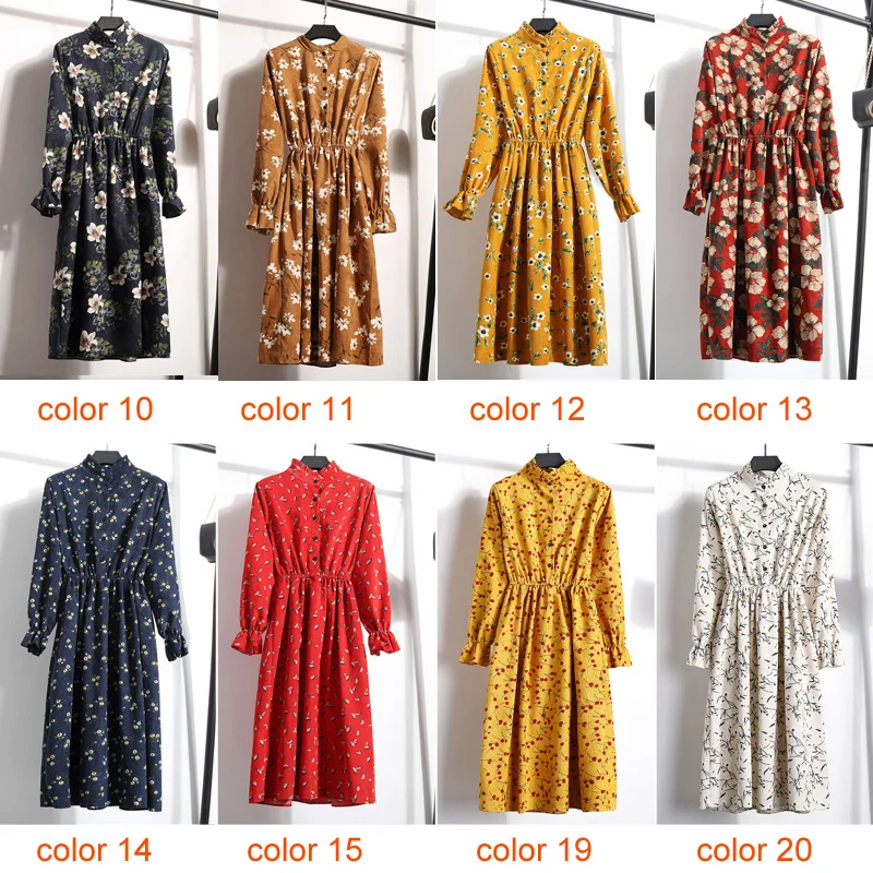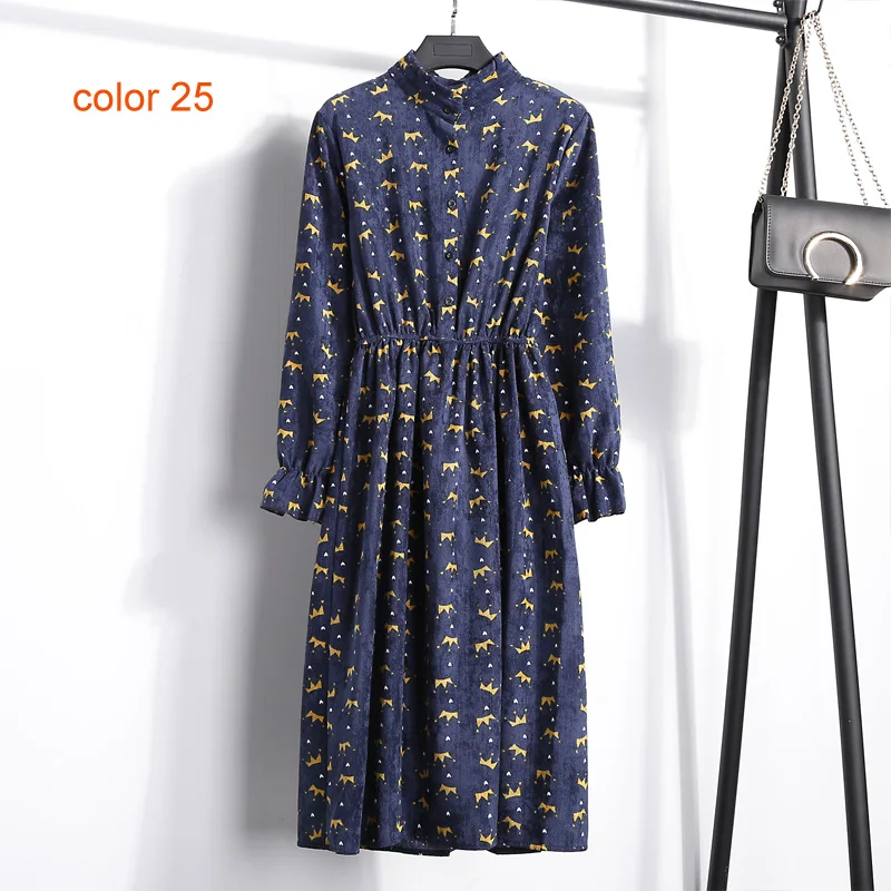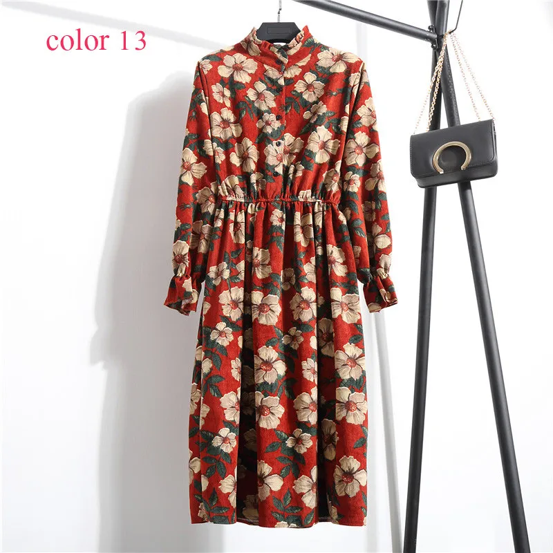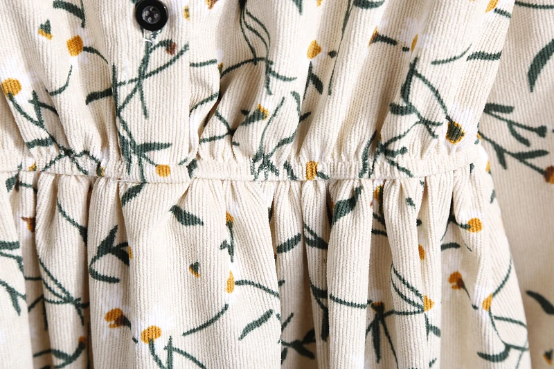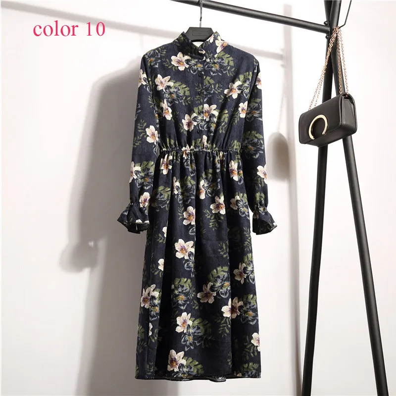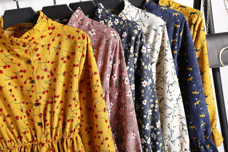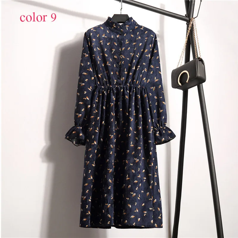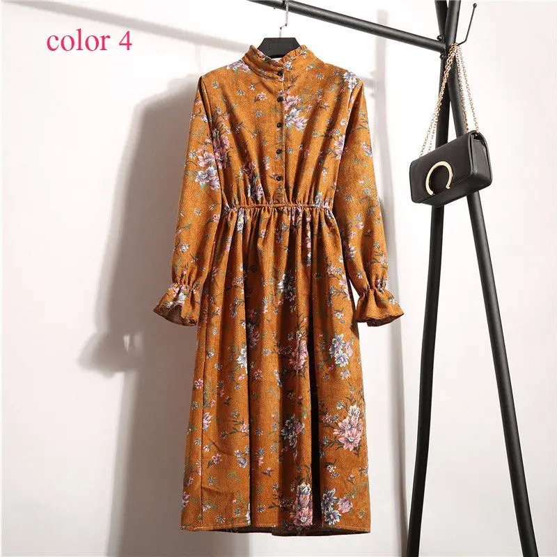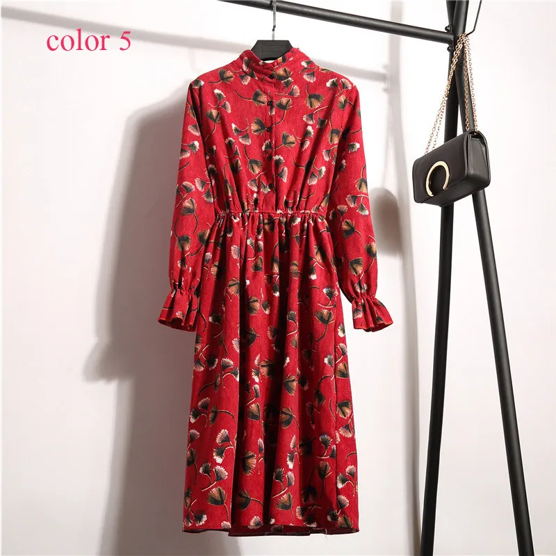 FREE SHIPPING Winter Corduroy Floral Print Women Elastic Waist Autumn Winter Dress JKP3583