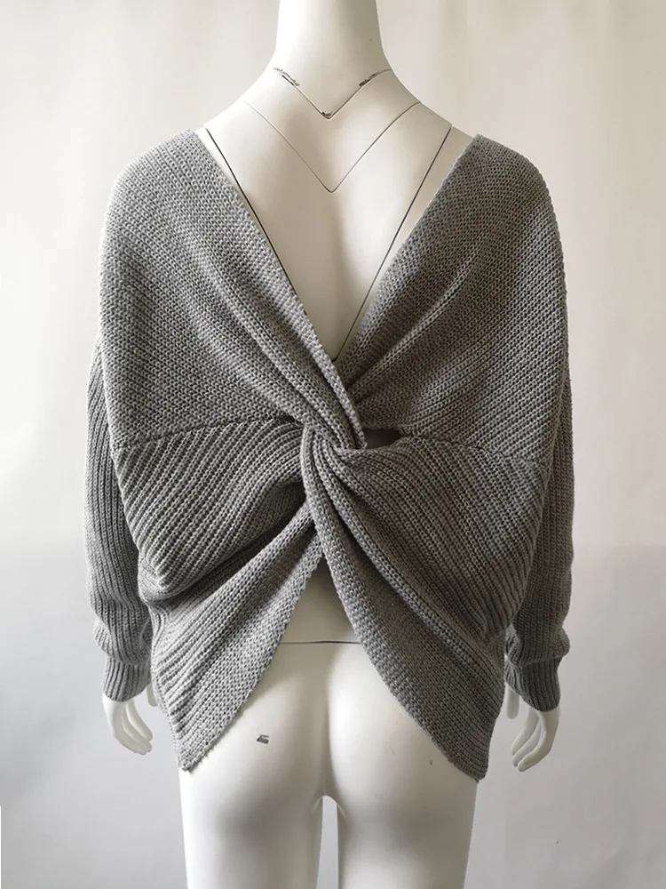 FREE SHIPPING Women Autumn Sexy Backless Cross Knitted Sweater JKP3121
