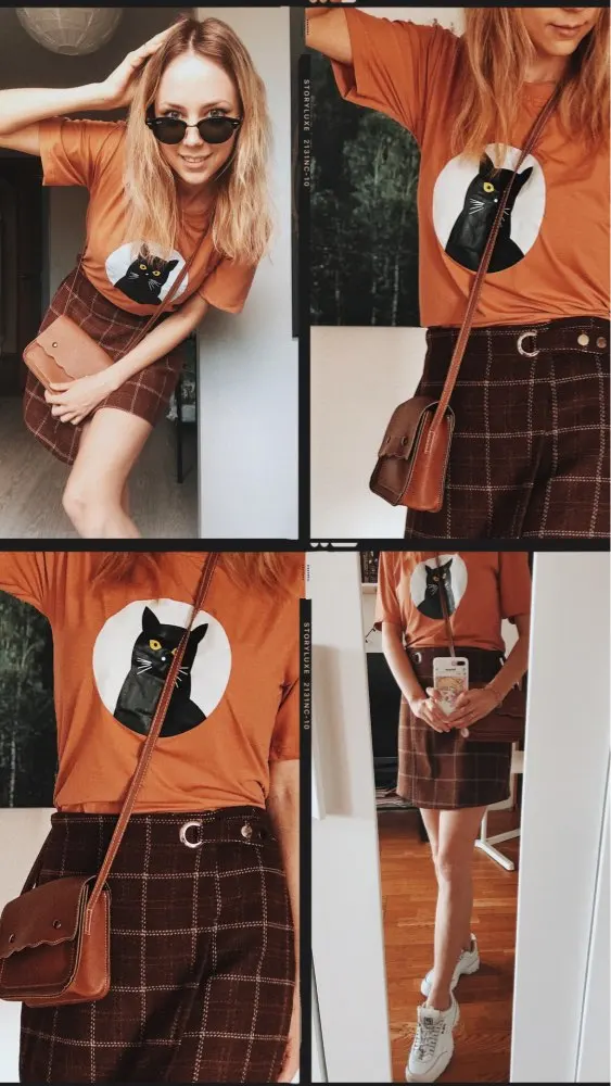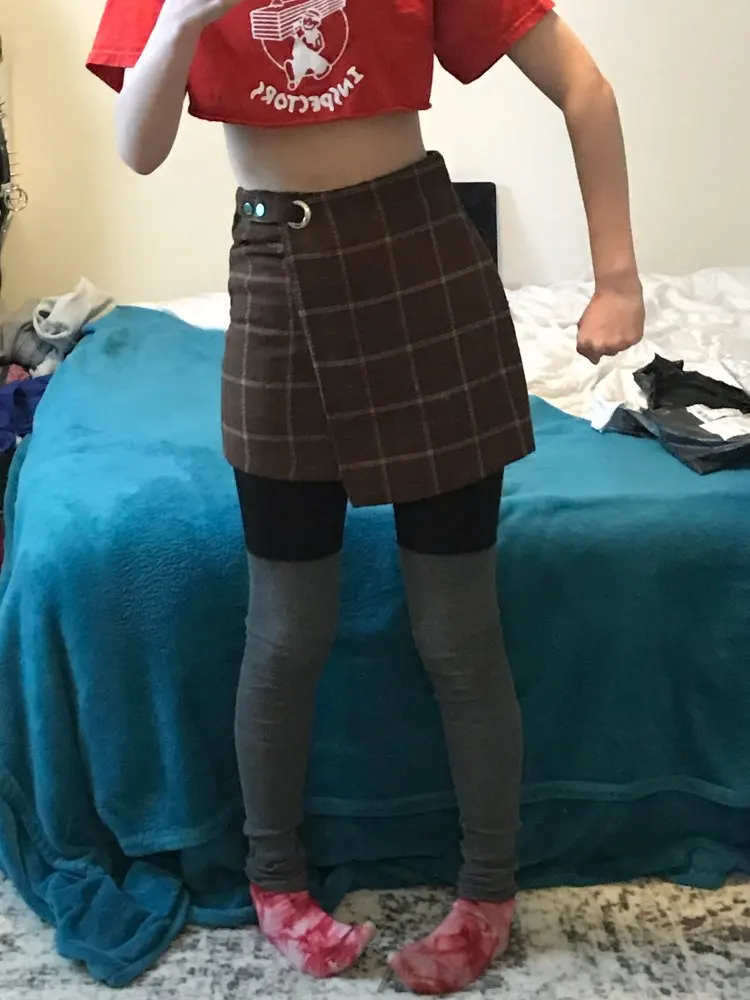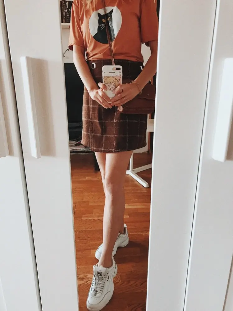 Sooo cool and stylish skirt for your money. Yes, it went 2 months, yes, after a while it will be covered with pellets, but it is good, and looks stylish with very many things, from sweaters to shirts. Milk chocolate color and neat cage. Back zipper. I fit the size right perfectly.