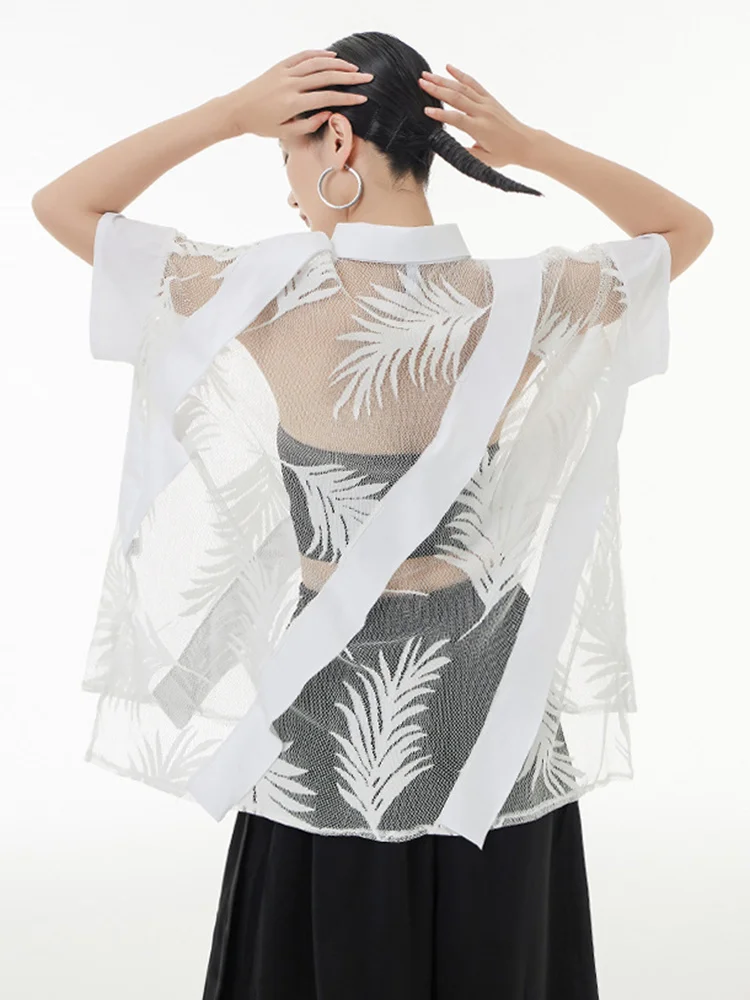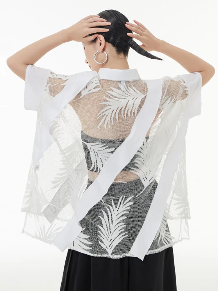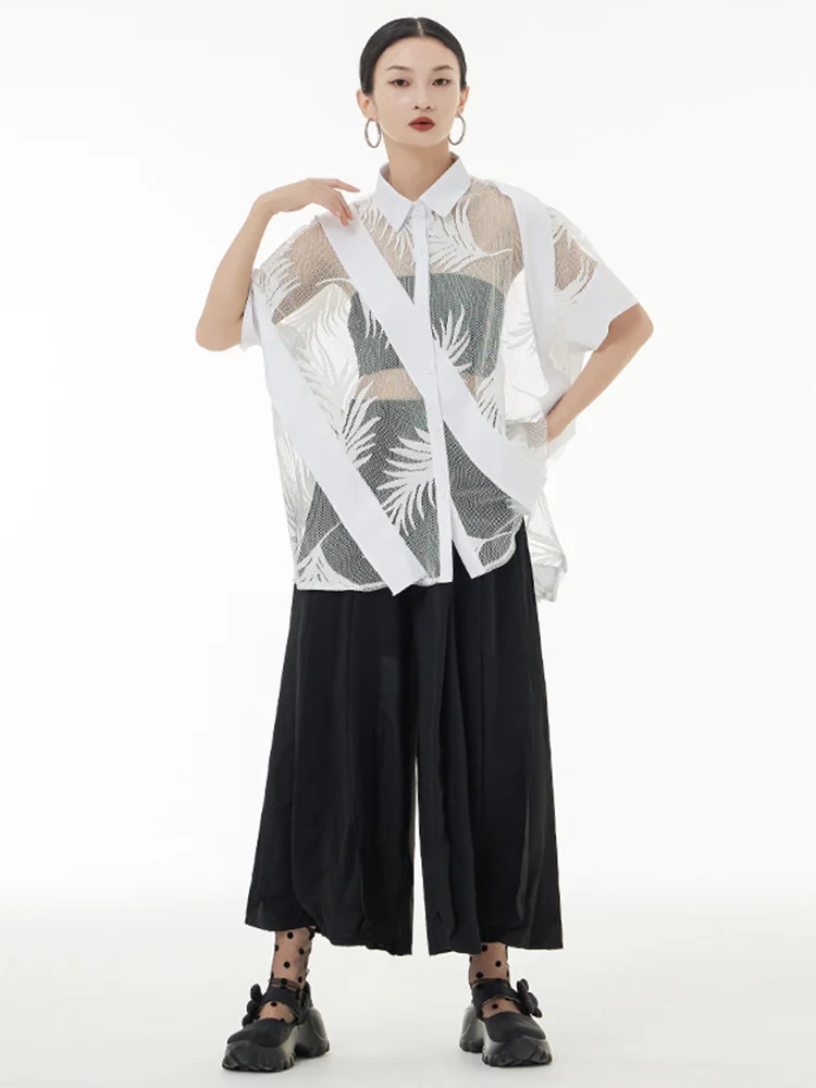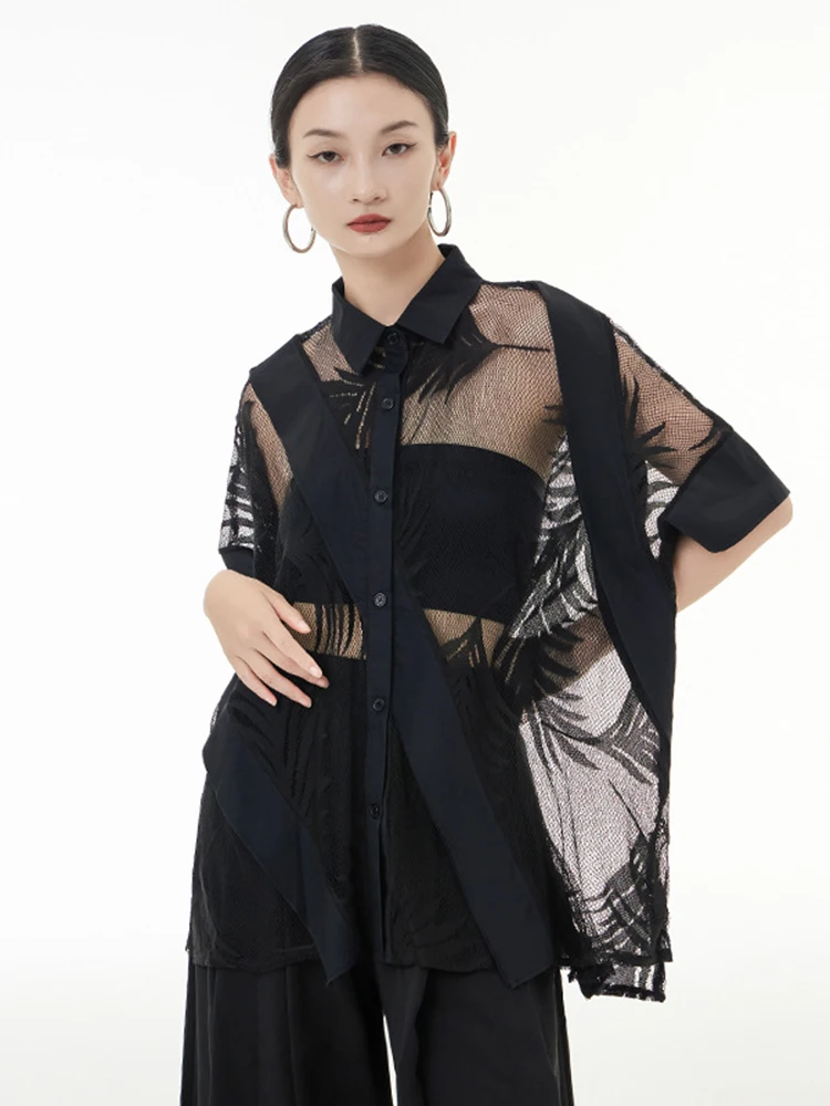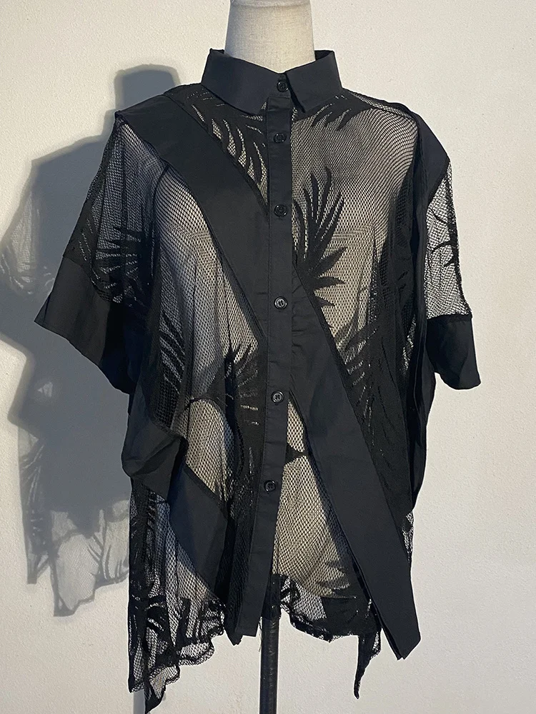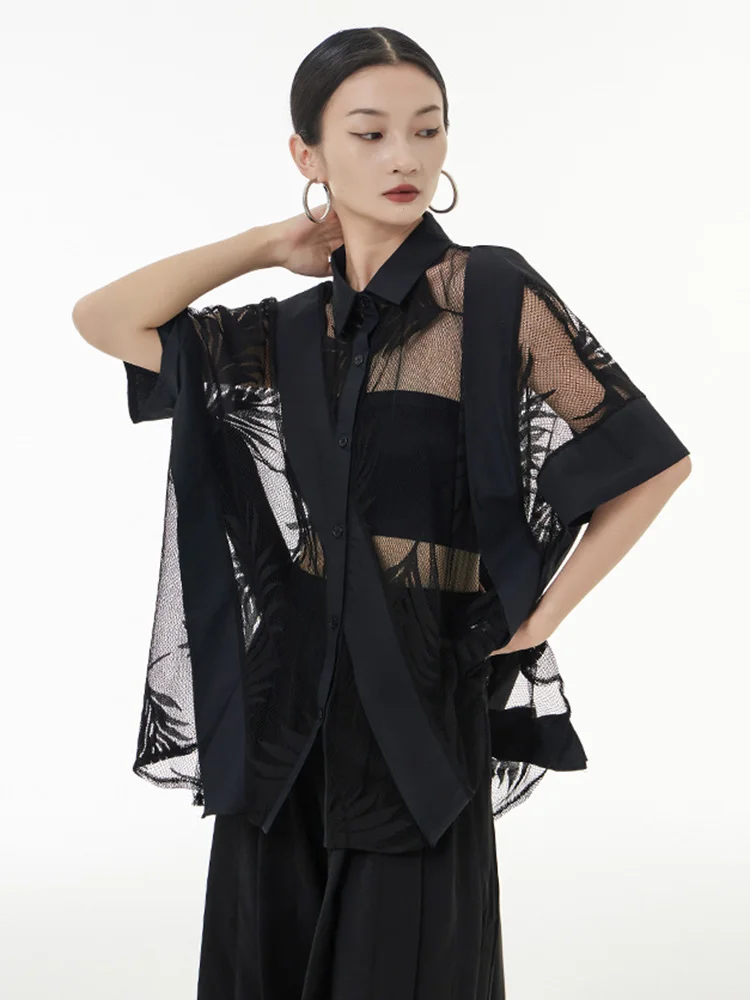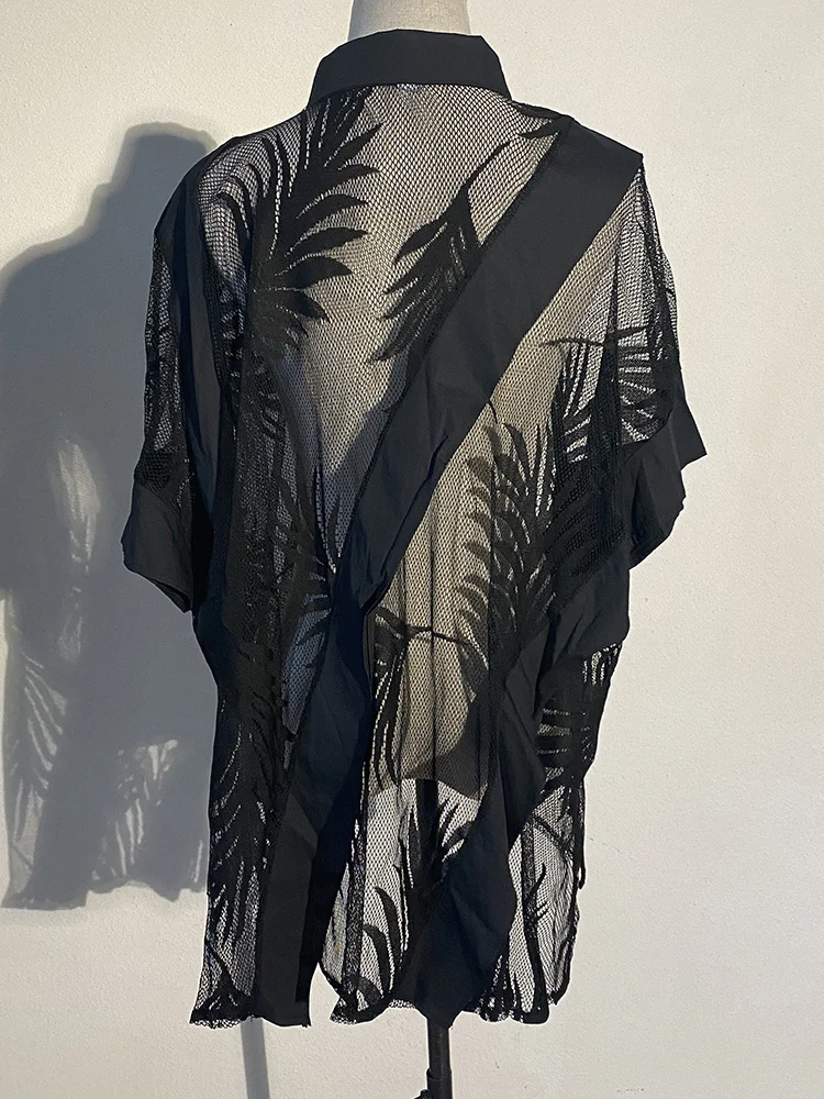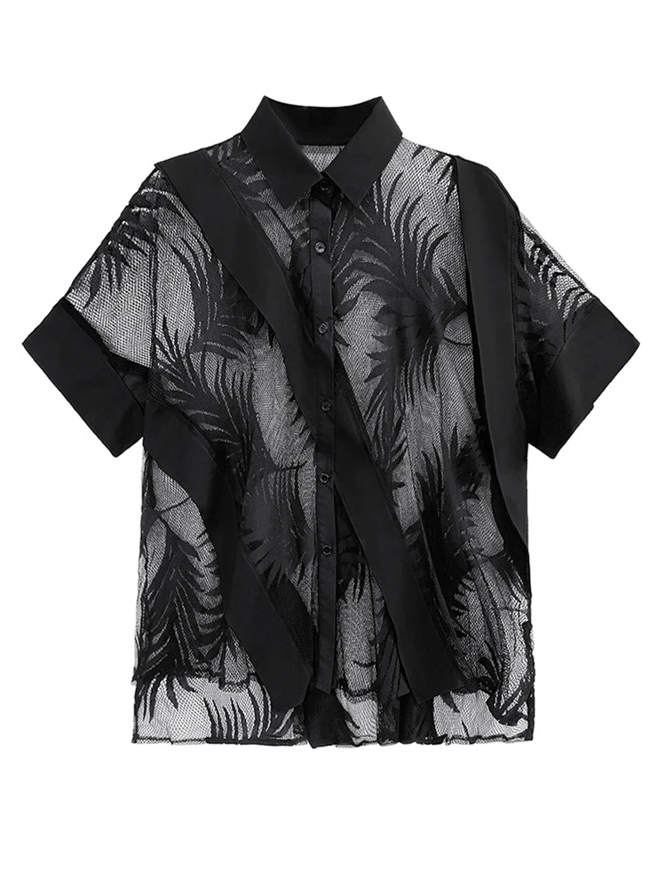 Free Shipping Women Black Lace Blouse Big Size Lapel Half Sleeve Loose Fit Shirt Spring Summer 2025 JKP7214