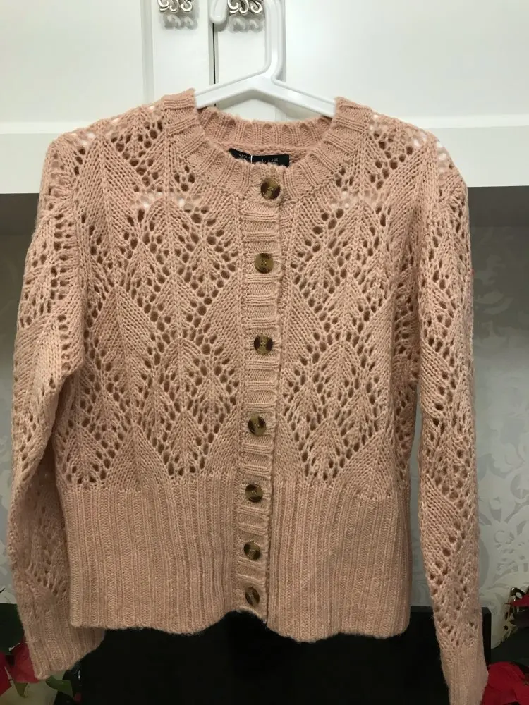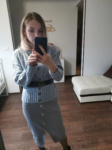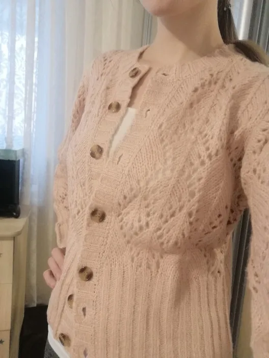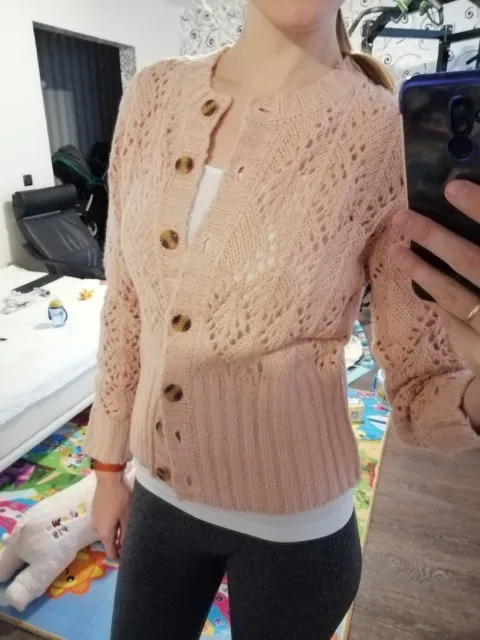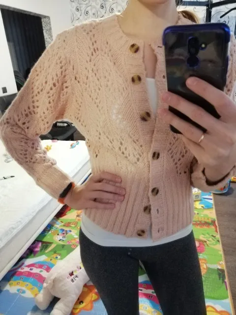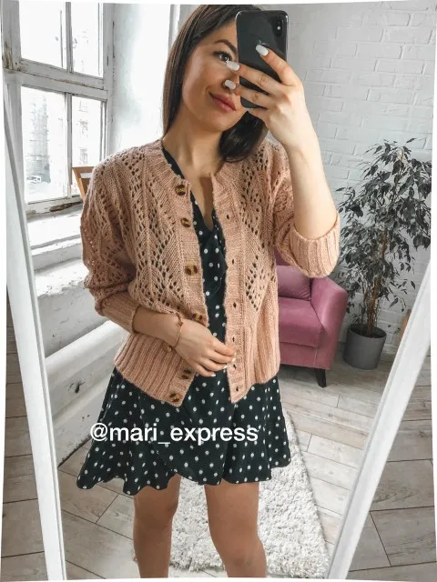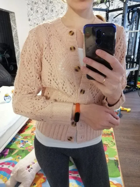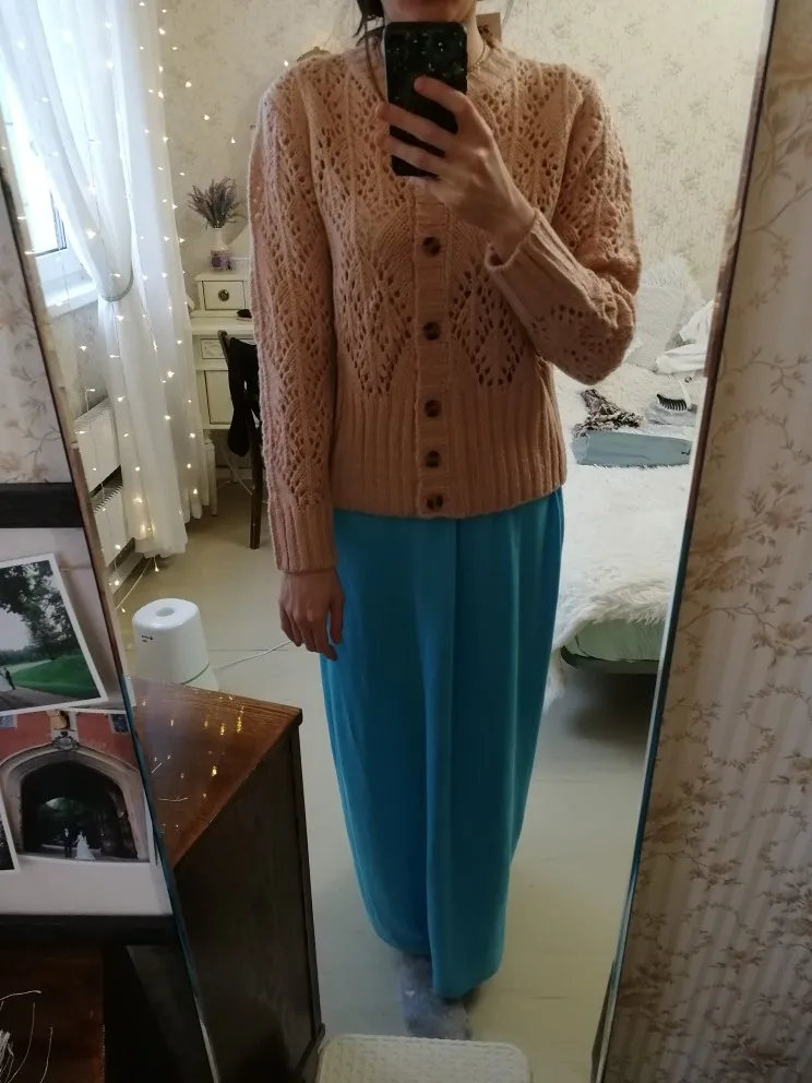 Cardigan I really liked. The basic thing in the wardrobe. The sleeve is long. Slightly loose at the waist at 42 size. Pale blue. But according to reviews, I saw it. In general, I really liked.