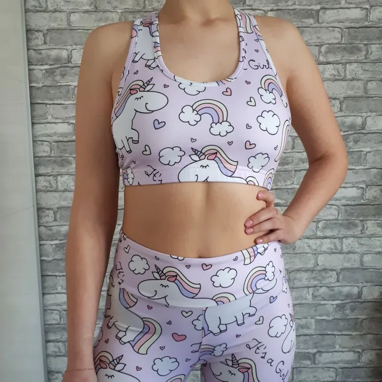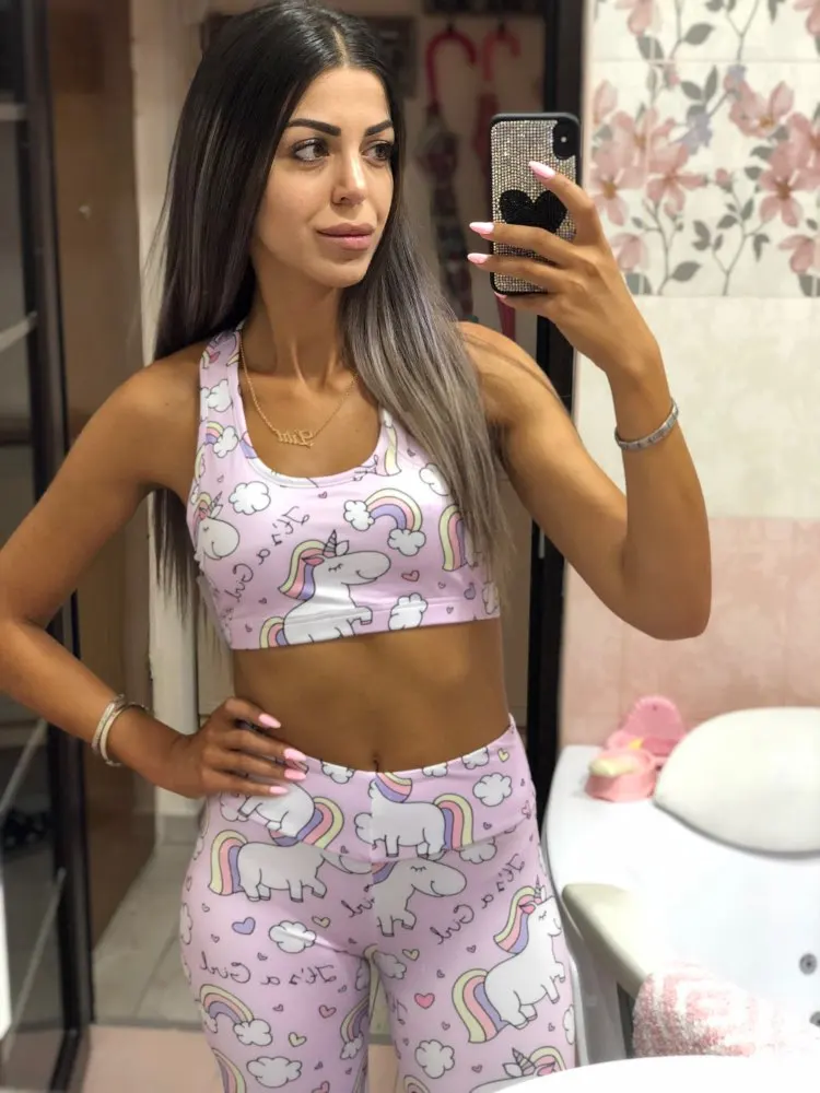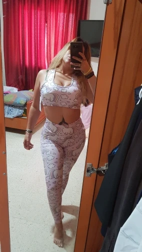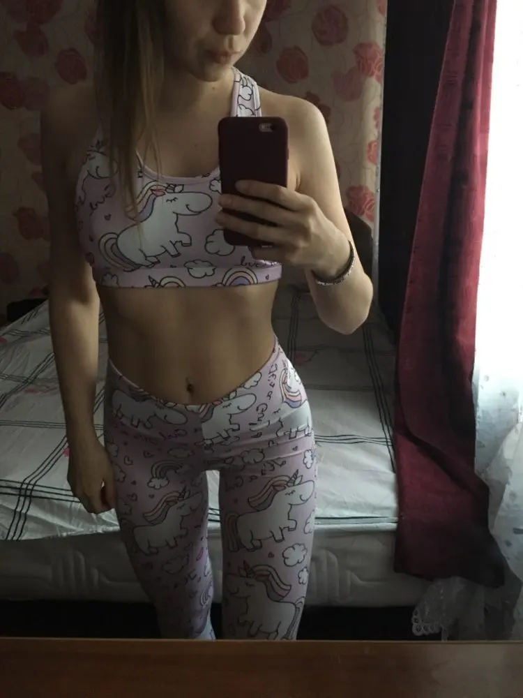 The suit is simply unrealistically steep, and the price is generally shock to be honest, for the first time i'm ready to say that the price is unreasonably low .. Size s on the parameters 89/64/90 sat down with a slight failure, but still good. The top sits perfectly, but the leggings are a little big at the waist (seen in the photo), there would be an elastic band a little tight, it would be perfect. On the height of 164 in length, there is still a stock, high girls can be safely taken, but girls on the height below-already have to turn. The quality is excellent, the only thing that has been erected is the uncooled seams on the pope, but this is to whom as to taste. In other places, the print looks good. Material polyester + spandex, very elastic, stretches perfectly. To the touch is pleasant, soft. Thin, due to the light color a little (quite a little) shines through dark underwear when practicing (!). It is dark, with underwear flesh-colored such problems will not arise. By the way for the photo, i specially put on dark gray panties, you can see that nothing glows.