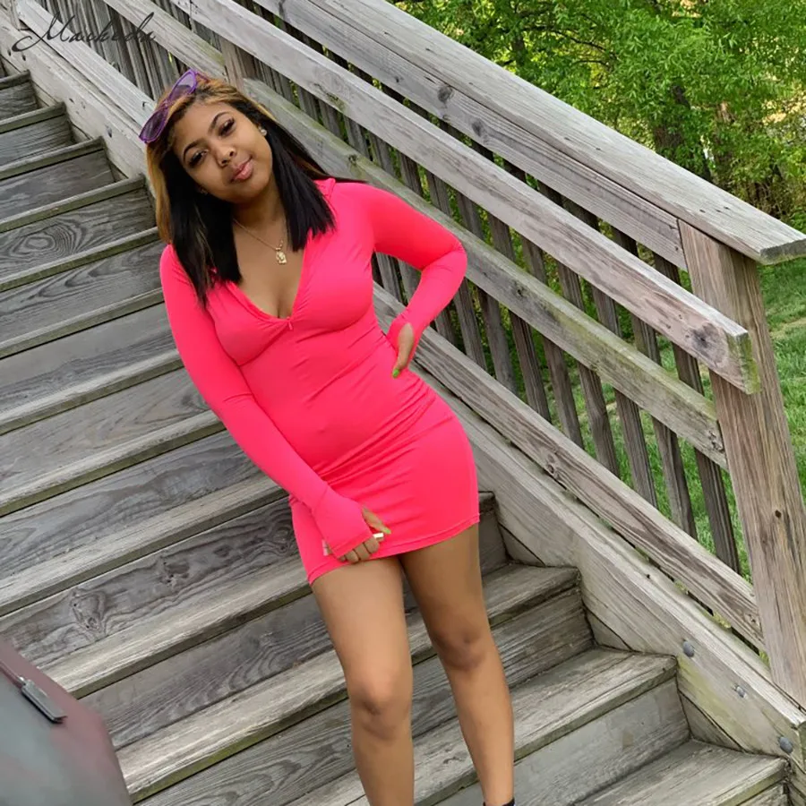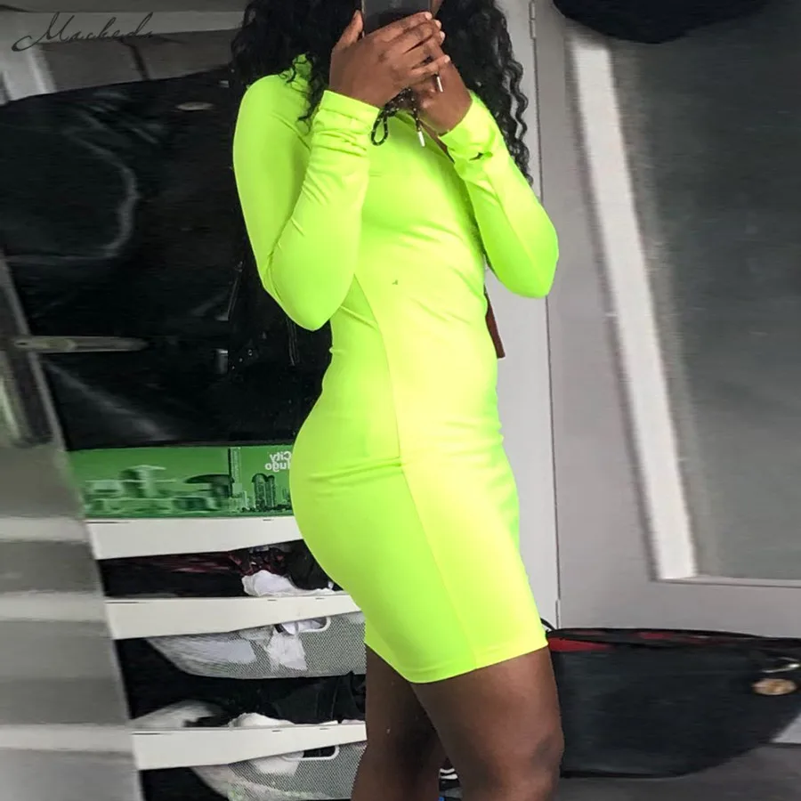 FREE SHIPPING Women Casual Long Sleeve Half Open Zip Collar Straight Solid Color Boedycon Dress JKP3573