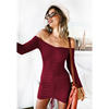 FREE SHIPPING Women Casual Long Sleeve Tight Sexy Off Shoulder Ruched Dress JKP1157
