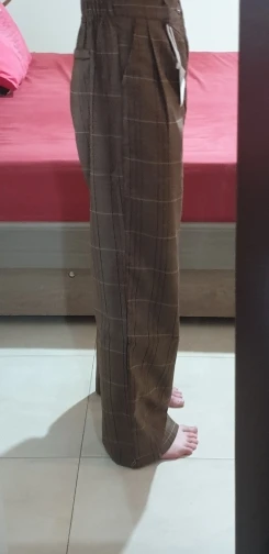 It is accurate to product displayed. Material feels nice, and it's suited for a more lighter season. It's not sheer and does not fit tightly around hips which is good. The elastic band on the back of the pants makes it easier for fitting and helps make the front of the waistband flat against your waist. Would buy from this buyer again.