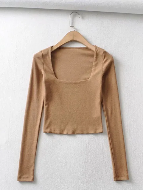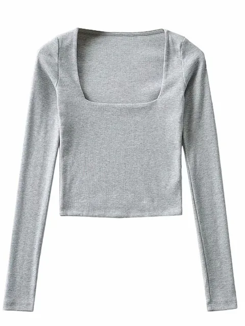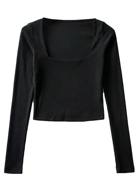 FREE SHIPPING Women Crop Top Cotton Ribbed Square Neck With Long Sleeve JKP7187