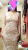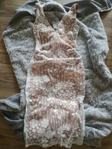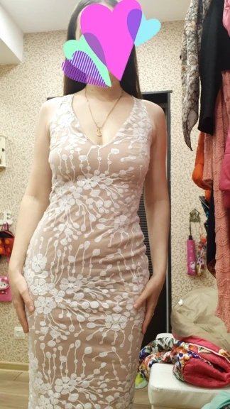 Delivery is super fast (11 days), the material stretches slightly, the lining is dark beige color, perfect even for such a pale pig like me, the lining under the dress is almost invisible. Poedki slightly crumble, but very little. I took a larger size, i climbed into the dress, i did not hang and not closely. The truth with my height of 160 cm dress is too long, i will cut. The cutout is deep, but with a brooch will look great. The cutout on the back is even deeper than the front, so the bra will be visible, but without it the dress can be worn, does not shine through. Also because of the deep cut on the back, not any pulling underwear can be worn. In general, the purchase is satisfied, after some correction will be ideal for me. Your money is worth it.