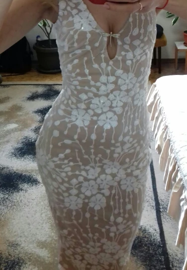 The dress is just a bomb! Sewn qualitatively, lightning is sewn akuratno, the seams are even. On my figure sits perfectly. Size s will suit you if you have a waist 60 cm. The cutout is deep, can be worn without a bra. I decided to wear it with a brooch. I have a special bra for a deep neckline, it can be found on ali. Thank you for the beautiful dress!