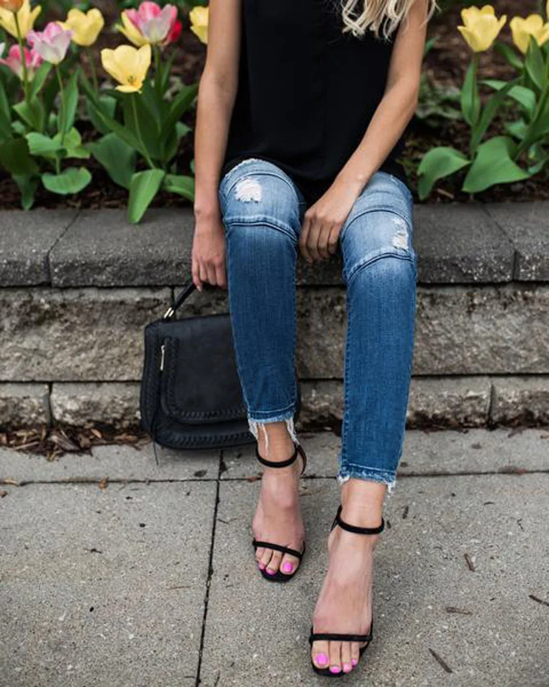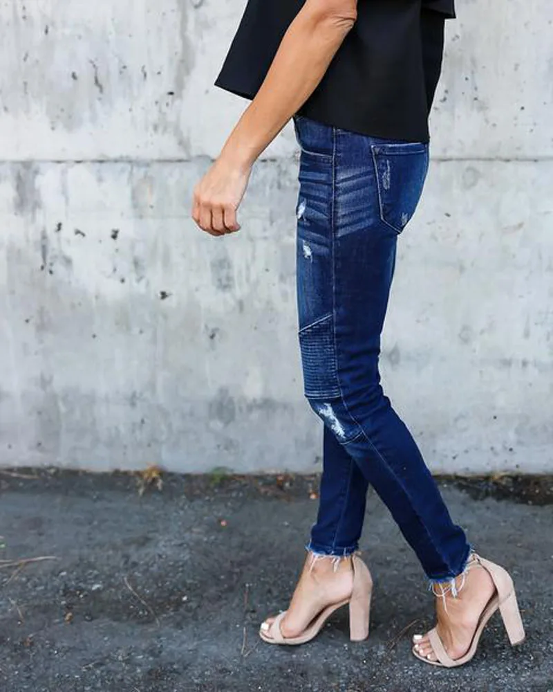 FREE SHIPPING Women Denim Skinny Pants Ripped Destroyed Pleated Stretch Jeans JKP3642