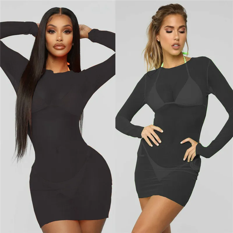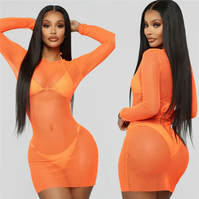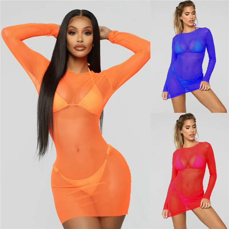 FREE SHIPPING Women Dress Sheer Mesh Cover Ups Swimwear Swimsuit Bathing Summer Beach Dress See-through Suit One Piece Sexy Soft Swimsuits JKP2303