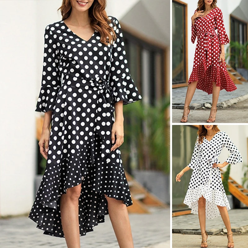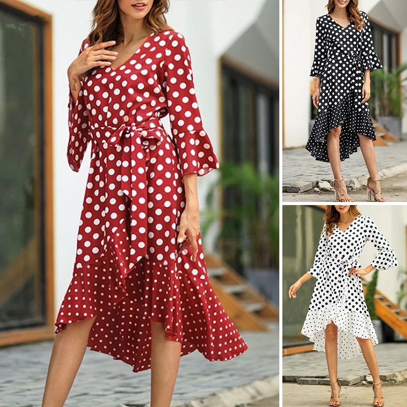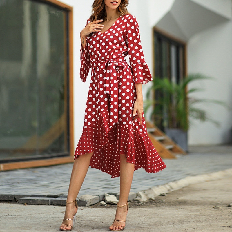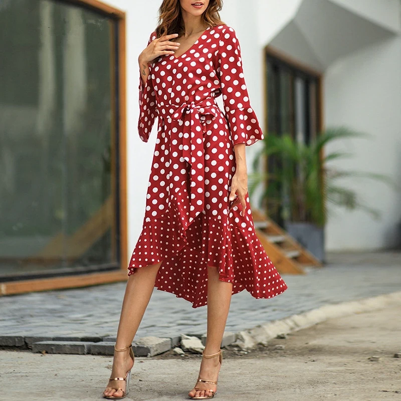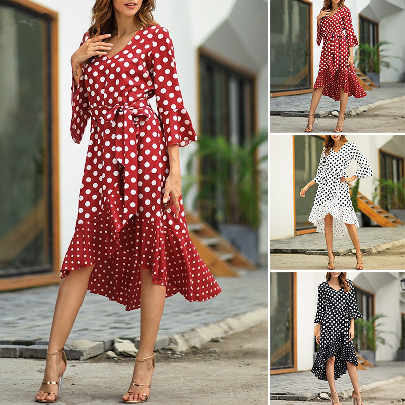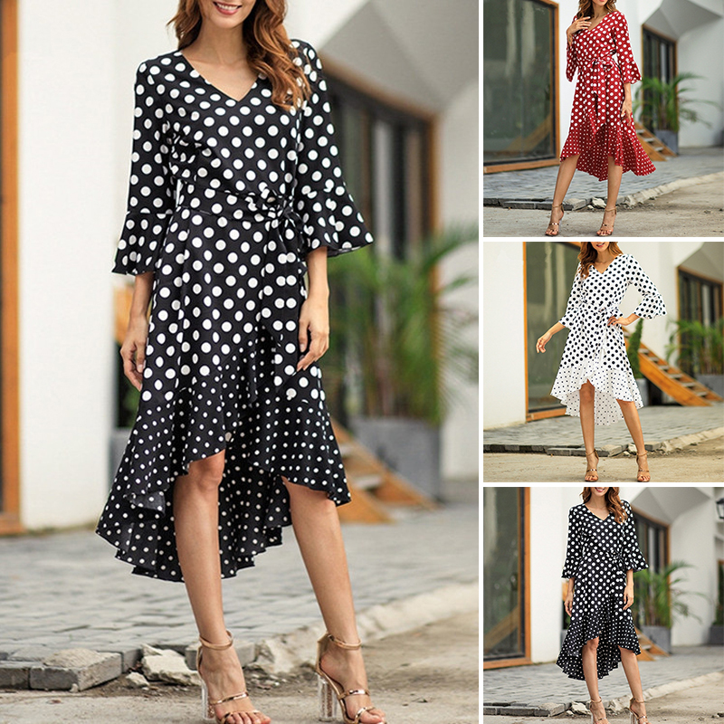 *Item Description:Women’s Dresses V-Neck Collar Dot Ruffle Irregular Hem Long Dress Fashion