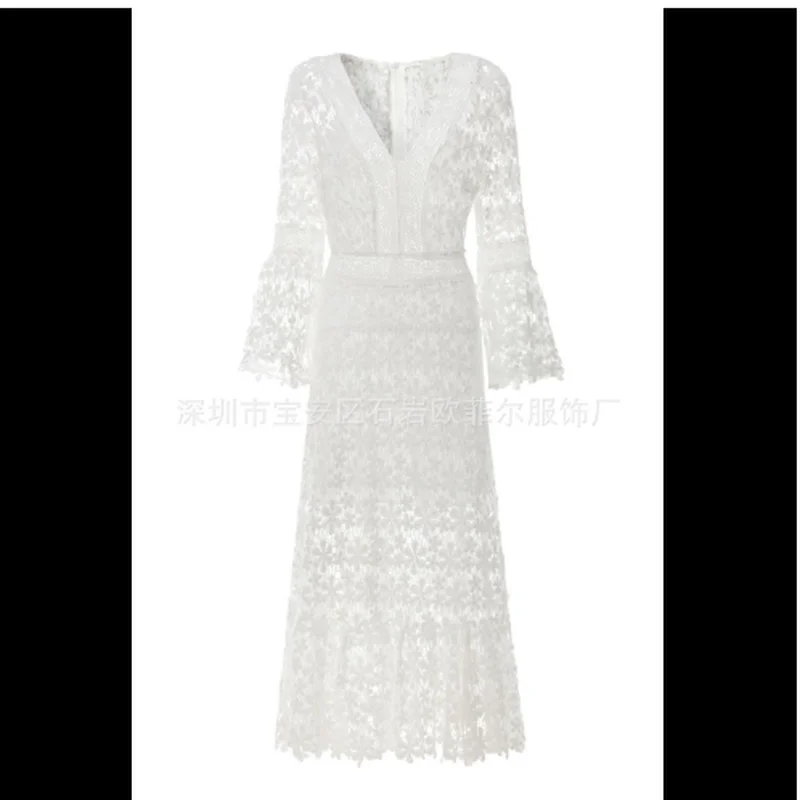 FREE SHIPPING Women Floral Lace Dress Flare Sleeve V neck Hollow Out JKP7195