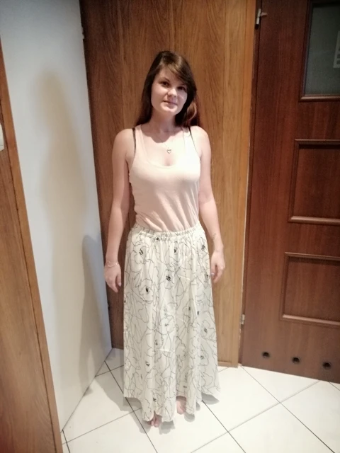 Very pretty skirt. Not prześwituje. Good quality material, no protruding yarns. Has wszytą petticoat. Material thicker, so in the spring, not summer. For 164 cm ankle length. I wear size S (EU) and is just in time :)