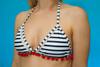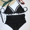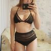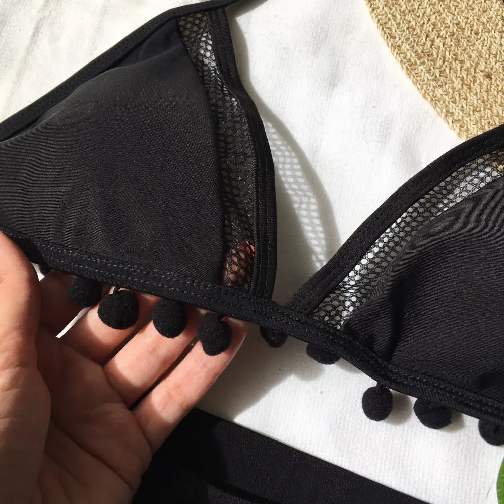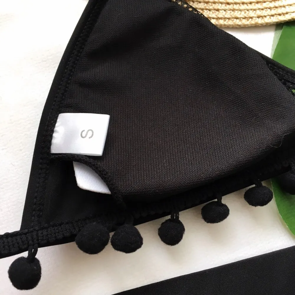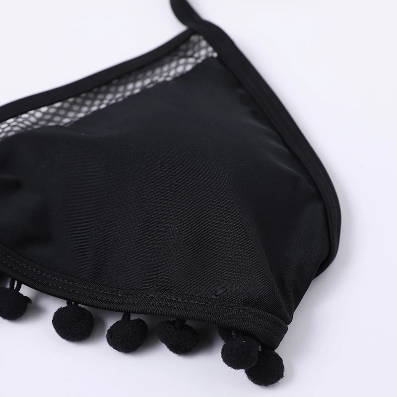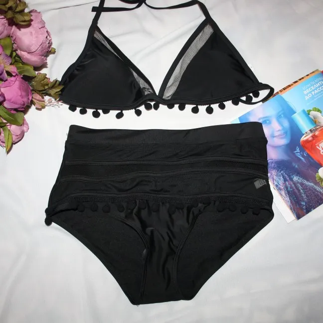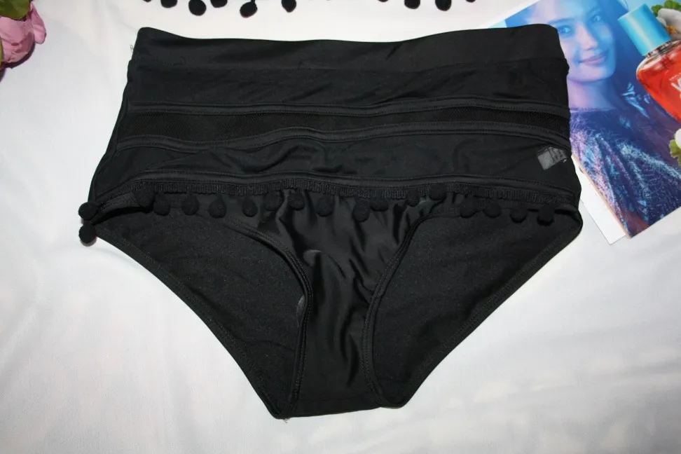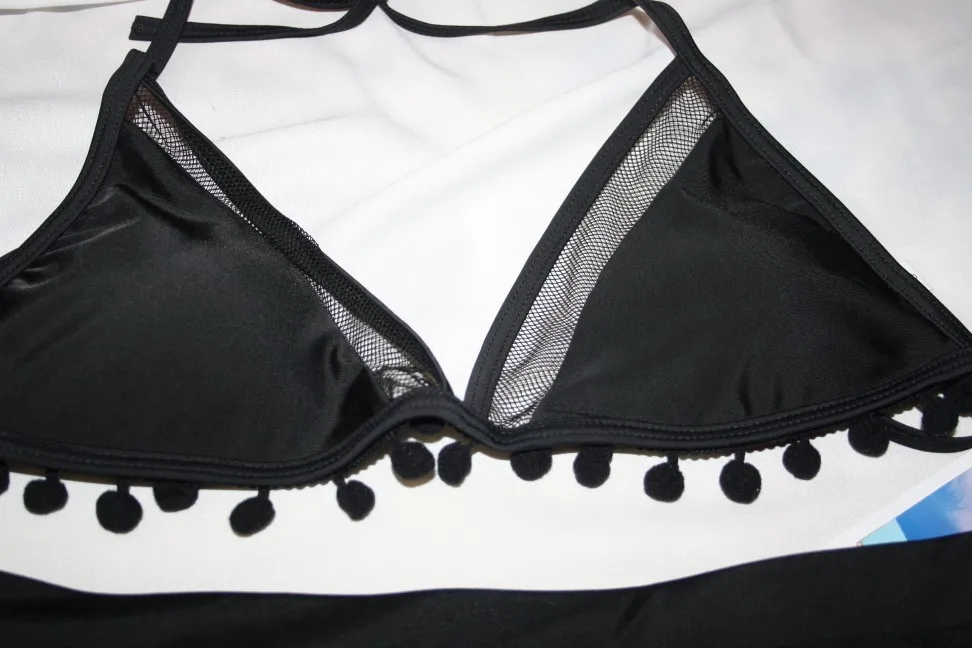 My parameters are 92/65/92. Swimsuit sat well. The bodice is adjustable, since it is on the strings. Triangle cups. Have thin liners. At the bottom of the bodice is decorated with pompoms. Suitable to the second breast size. Melting sat well. In the swimming trunks in front there are transparent strips. Behind they are solid black. Landing high. The fabric is dense, does not shine through.