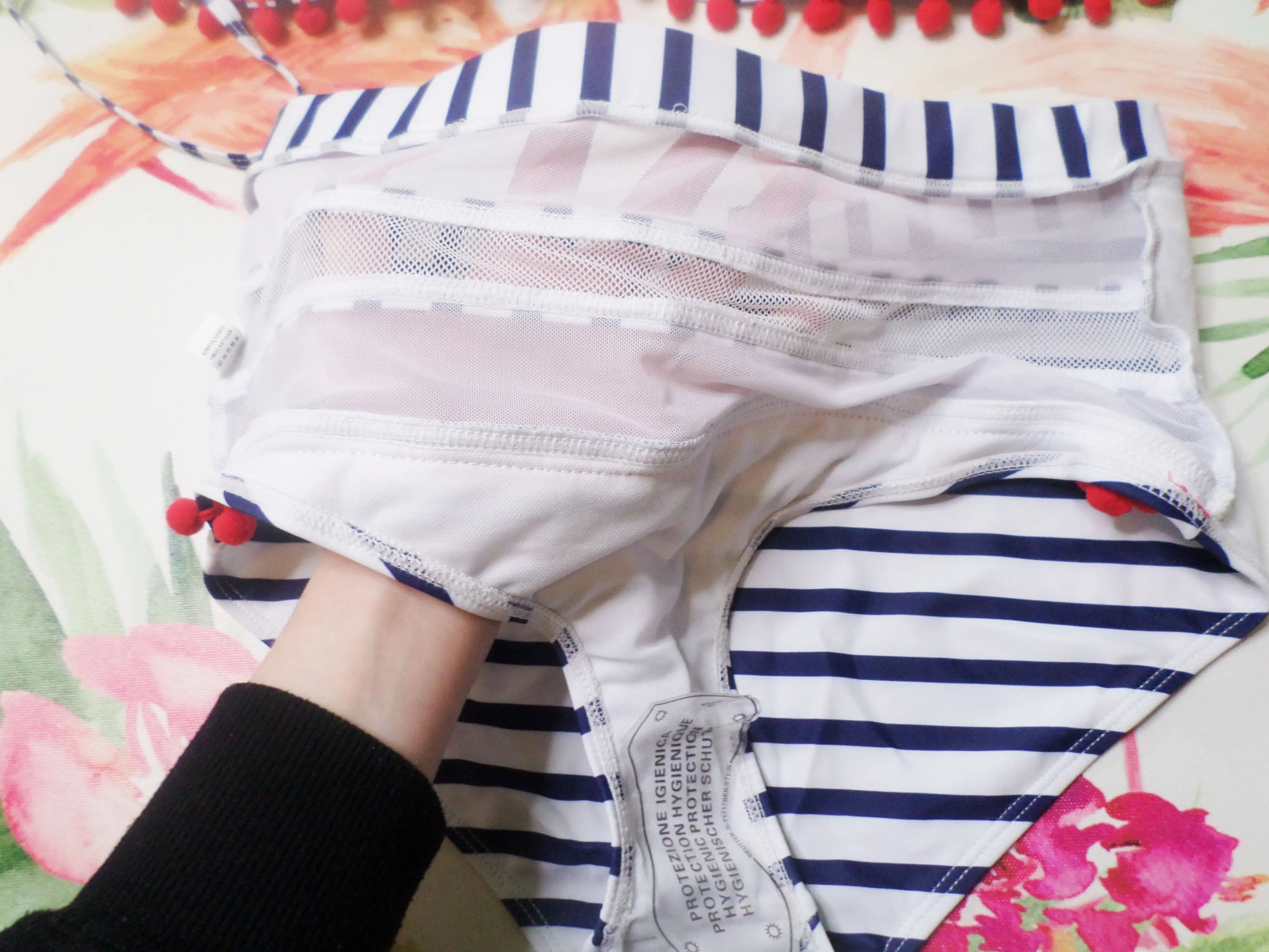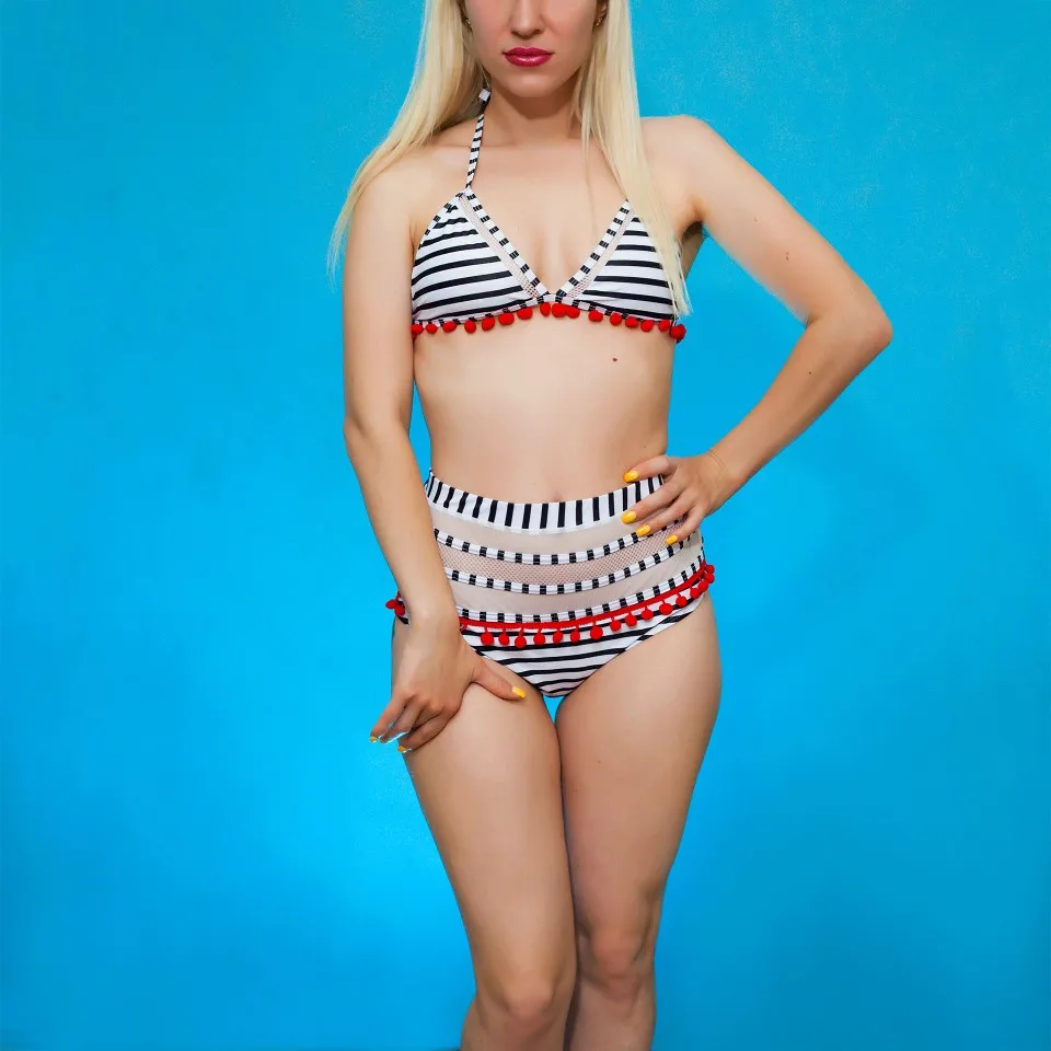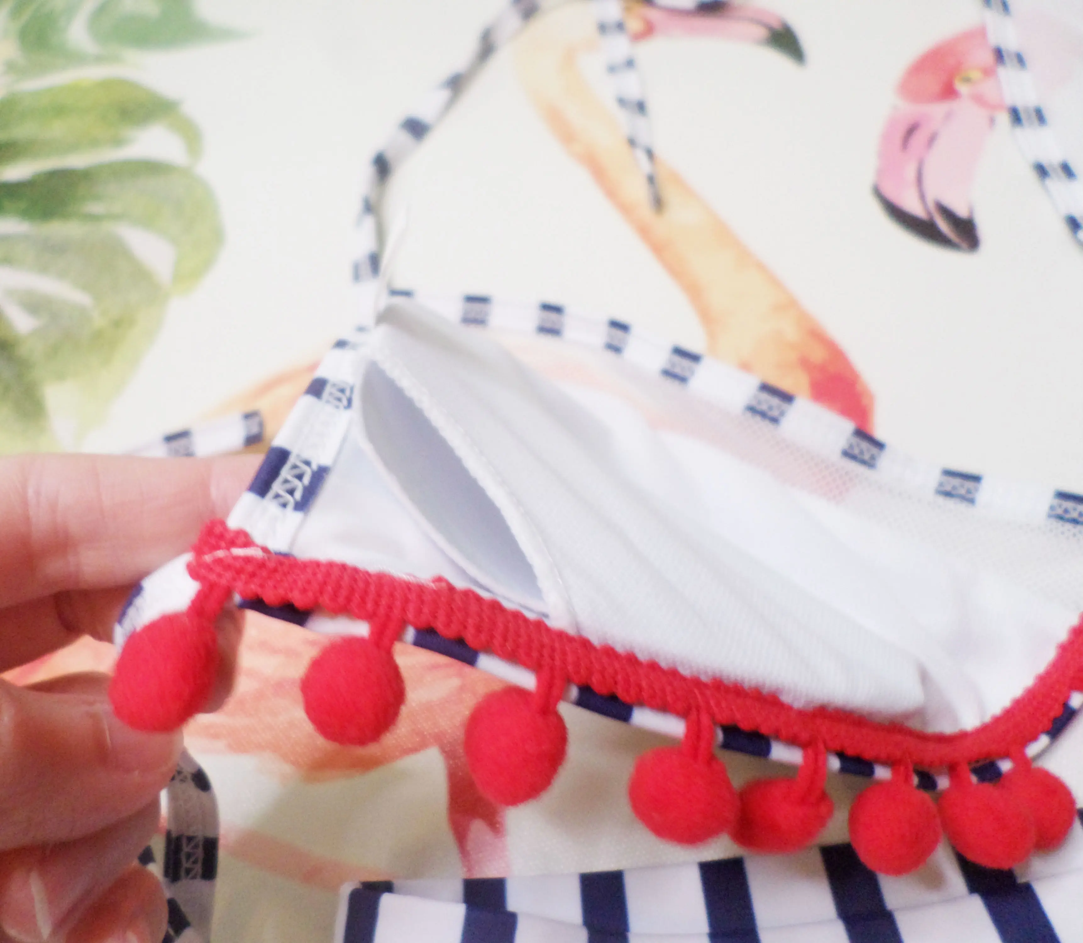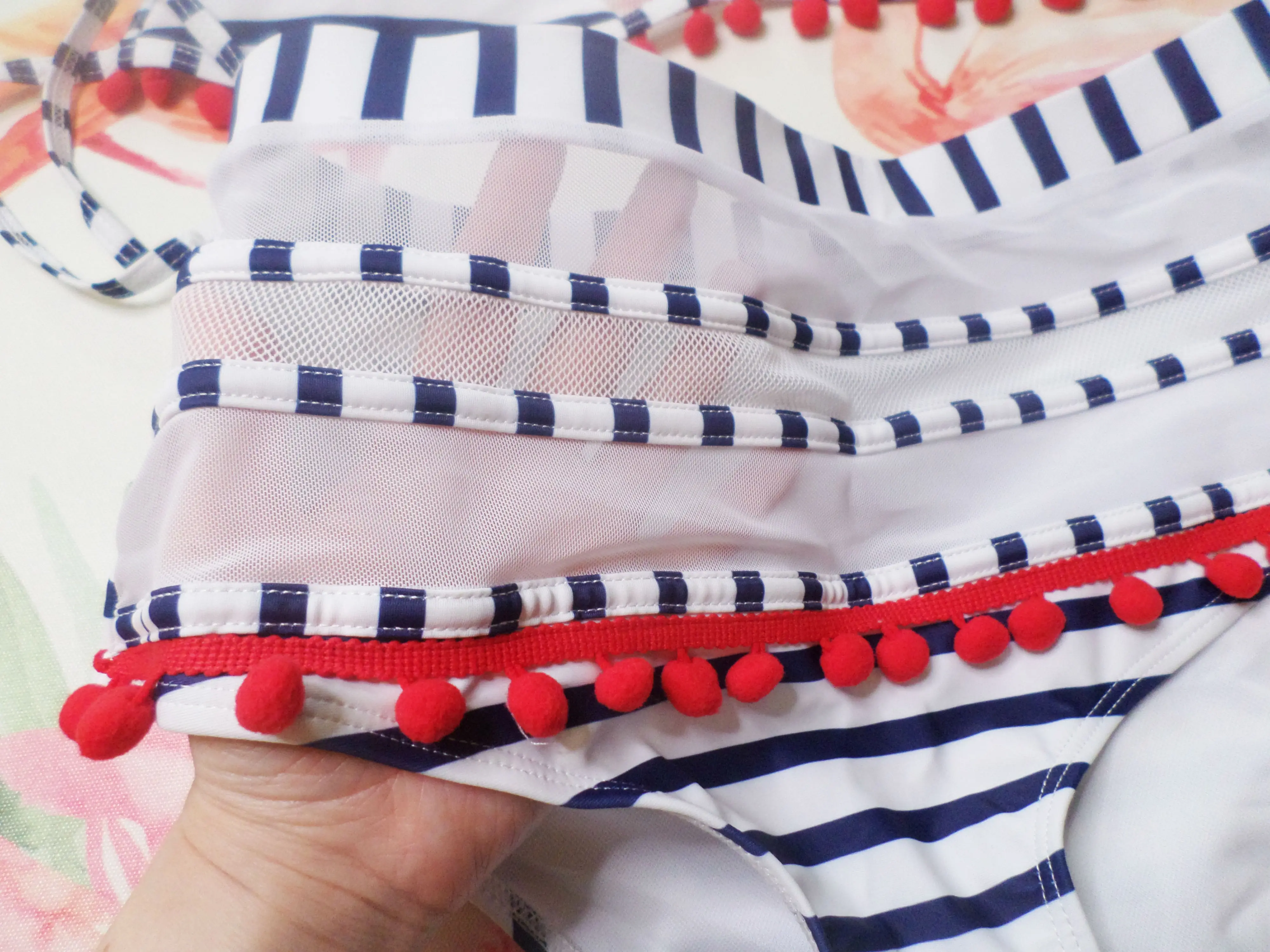 The parcel was received in moscow in about 12 days. The product was packed in a bag with zip lock. The store's choice of swimsuit is presented in three colors. I chose white without hesitation. Swimsuit chic, the quality of performance is excellent. On its parameters 85-65-90, bought the size s. swimsuit consists of a bodice and panties, white in a thin black strip. Material composition: polyamide 82%, elastane 18%. Bodice at the strings. Available paralon inserts. If necessary, which can be removed. At the top of the decor is made of white mesh. At the bottom of the bodice are sewn small red pom-poms. Panties with a high fit. Unfortunately there was no protective sticker. On the panties from above in the front there is also a decor of white mesh and sewn red pompons. Swimsuit with knitted lining, for the fact that it will shine through, you can not worry. Swimsuit i liked, it is very bright and comfortable. The material is dense, the workmanship is five plus. I recommend to buy!