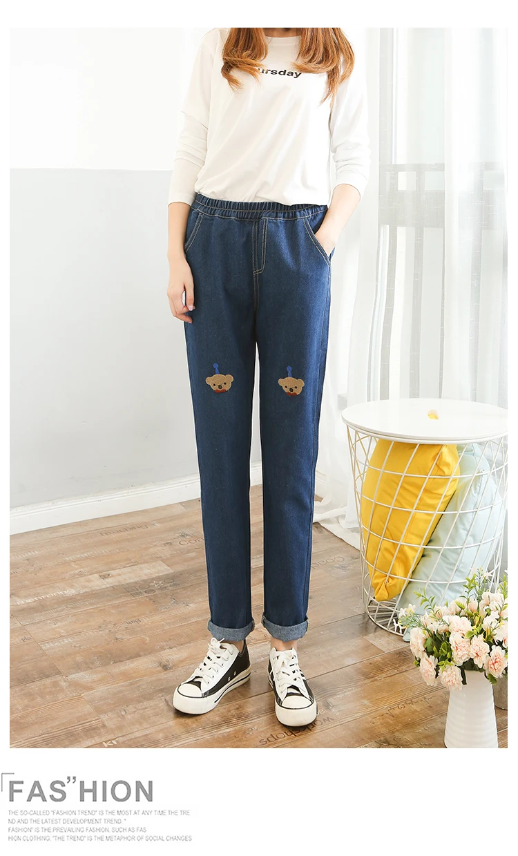 WITHZZ Autumn Women High Waisted Casual Trousers Streetwear Denim Slim Trousers Elastic Waist Pants Cartoon Embroidery Jeans