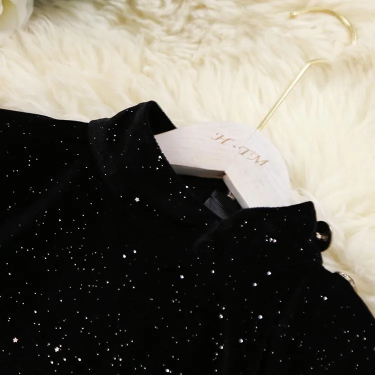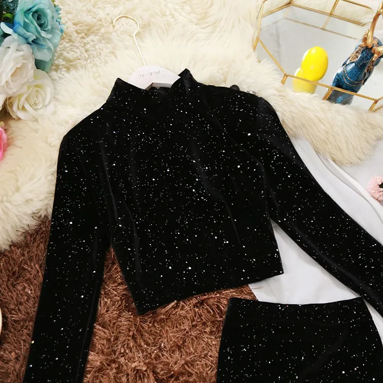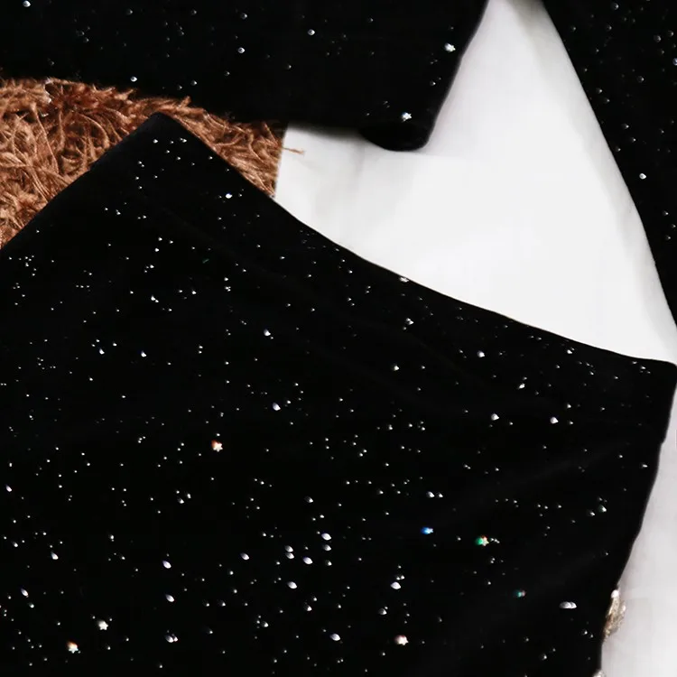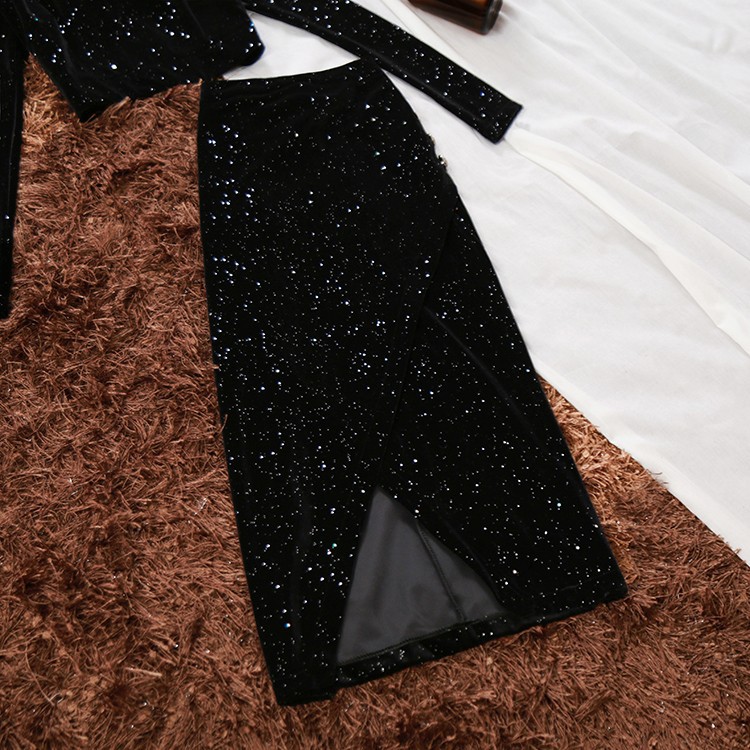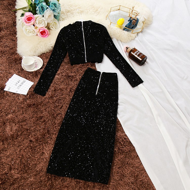 FREE SHIPPING Women O-Neck Sequined Velvet Shirt + High Waist Split Bling Bag Buttocks Long Skirt Two Piece Set JKP3623