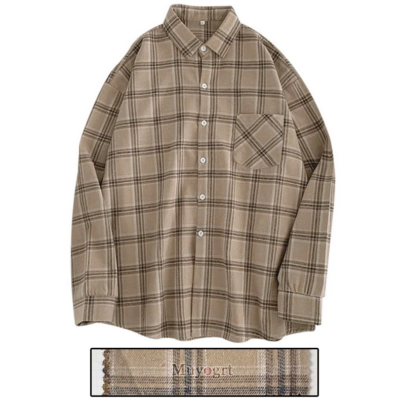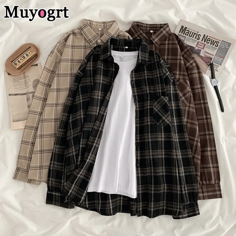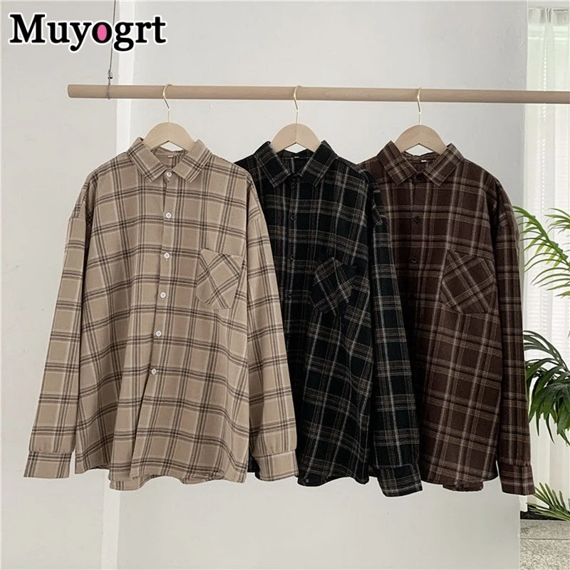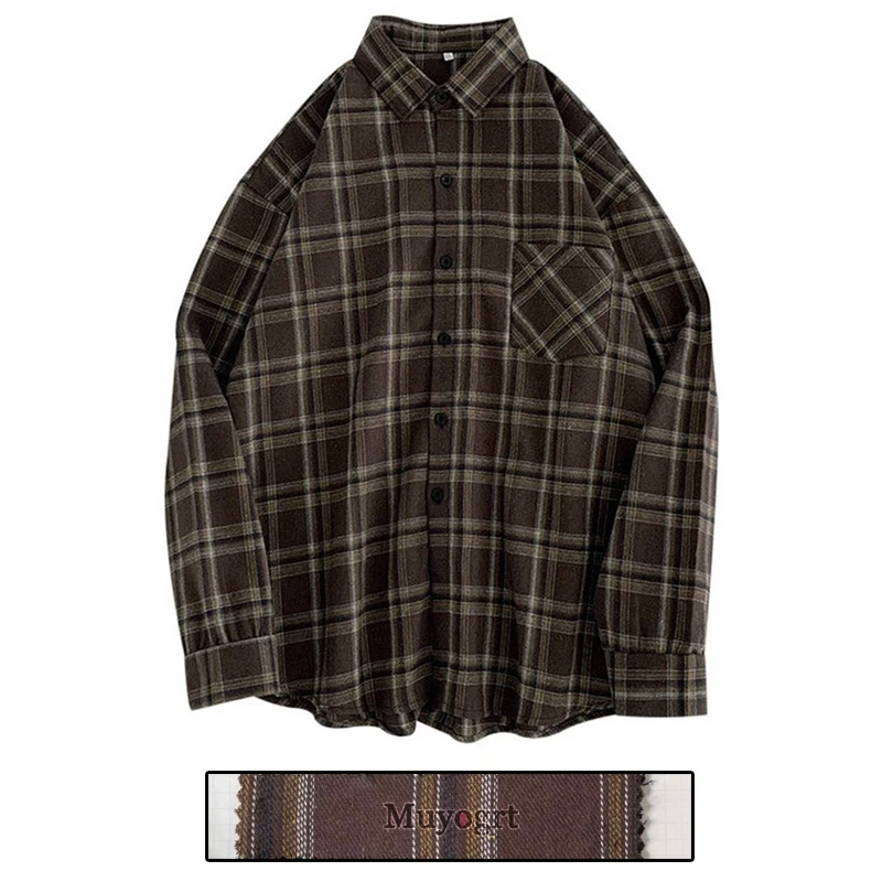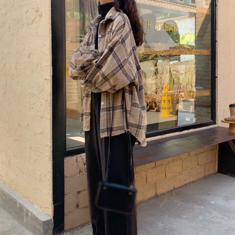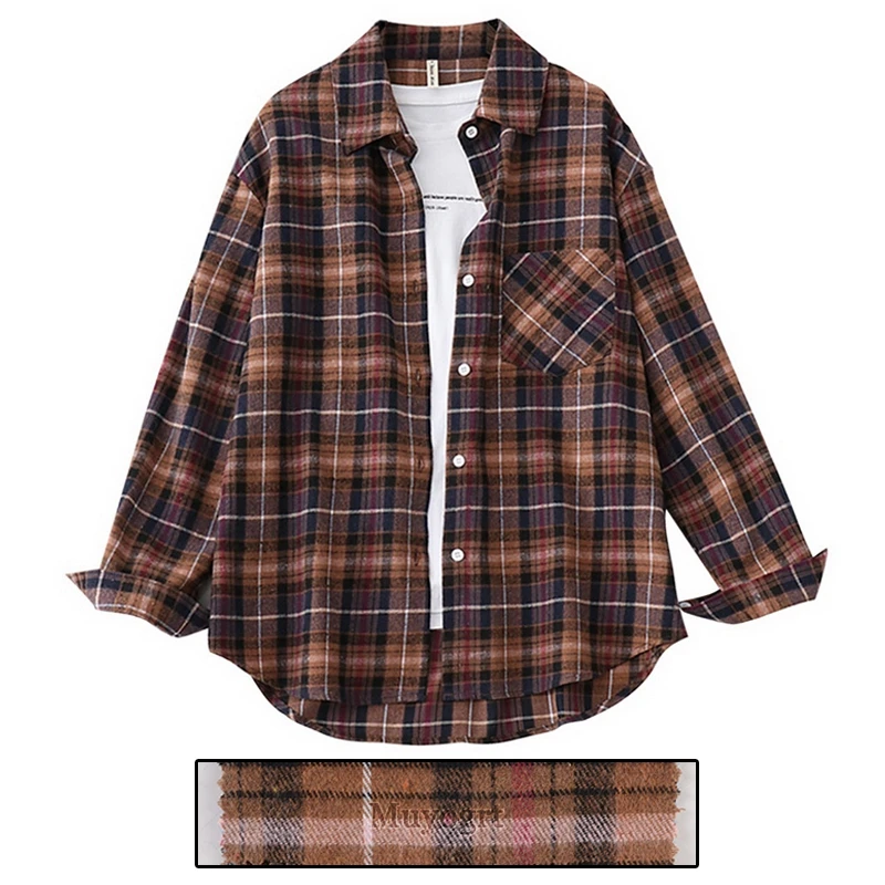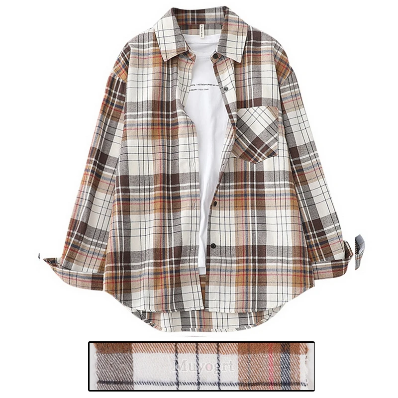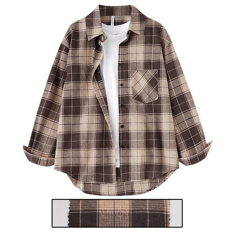 FREE SHIPPING Women Oversized Brown Plaid Shirt JKP4808
