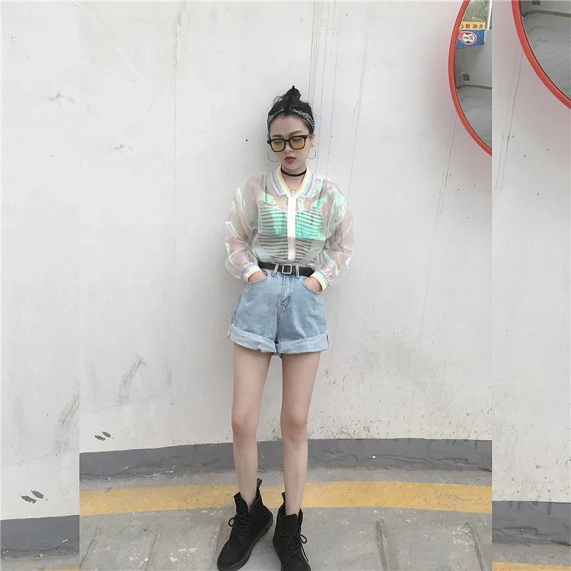 FREE SHIPPING Women Rainbow Hologram Transparent Bomber Jacket JKP1325