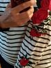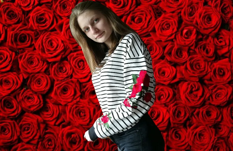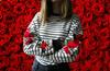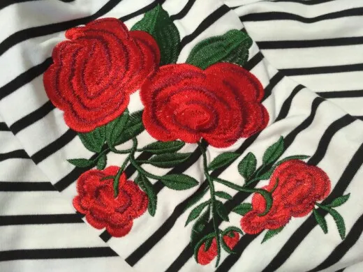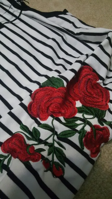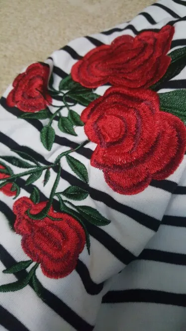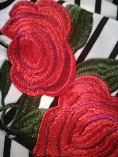 Perfect fit. Extra room. Durable. Cozy. Purple and red roses. Green leaves. High quality embroidery. Hip length.