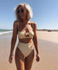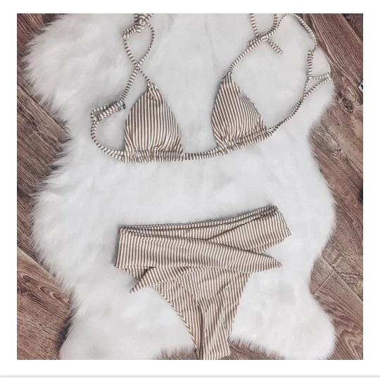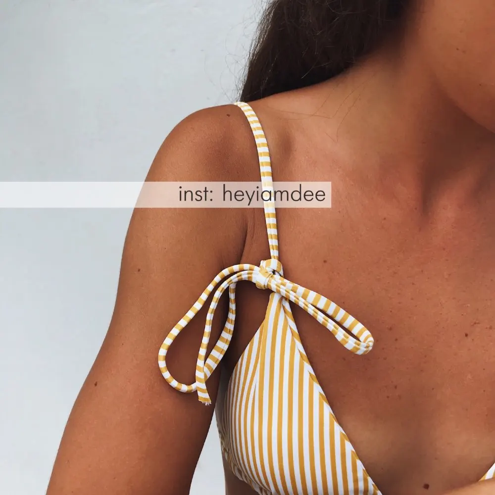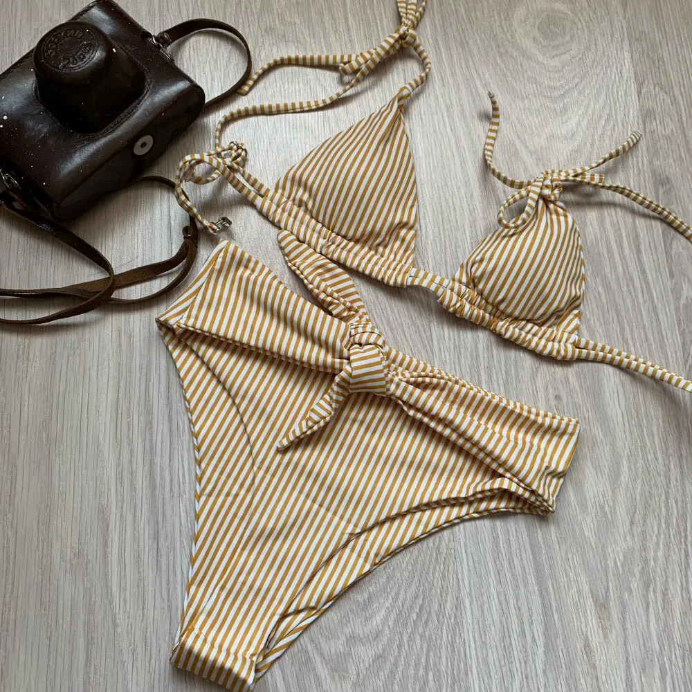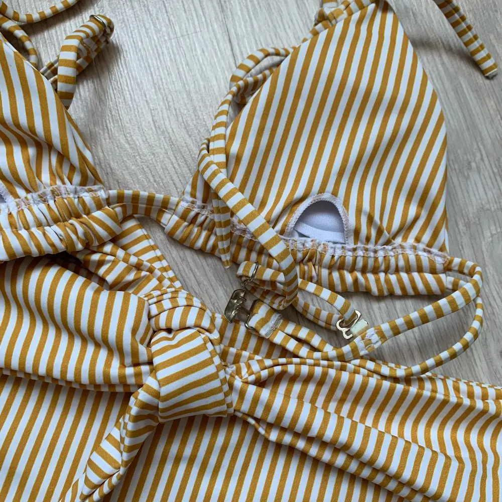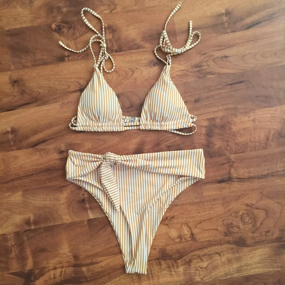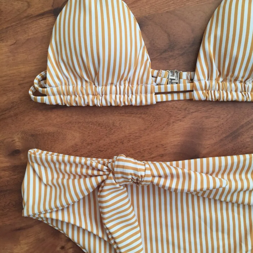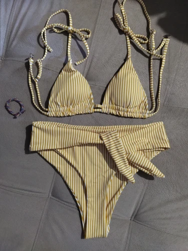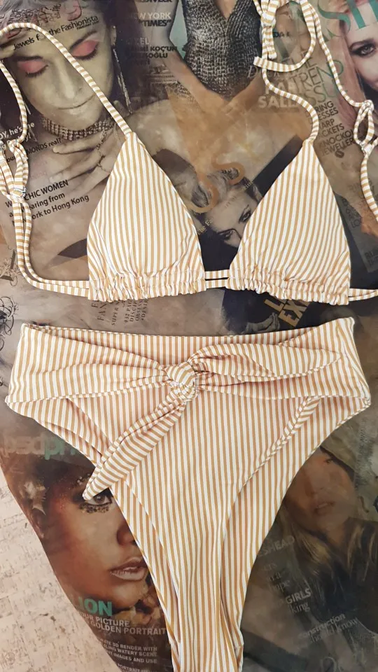 Cool bikini in forever fashionable stripes. The design also really liked, even though the bodice on me is too small. The color is milky in a thin strip of ochre color. Plavochki with a high fit, quite open behind the front beautifully tied to the knot. The bodice with a small filler, which can be removed. the straps are adjustable. Size i have m. my parameters: 88-70-95. Plavochki sat perfectly, but the triangles in the elevator are a little too small. very sexy it turns out Sewing quality factory. There is a hygienic sticker. Shipping about 2,5 weeks. track tracking