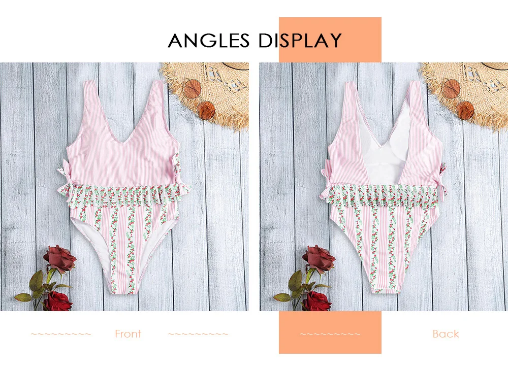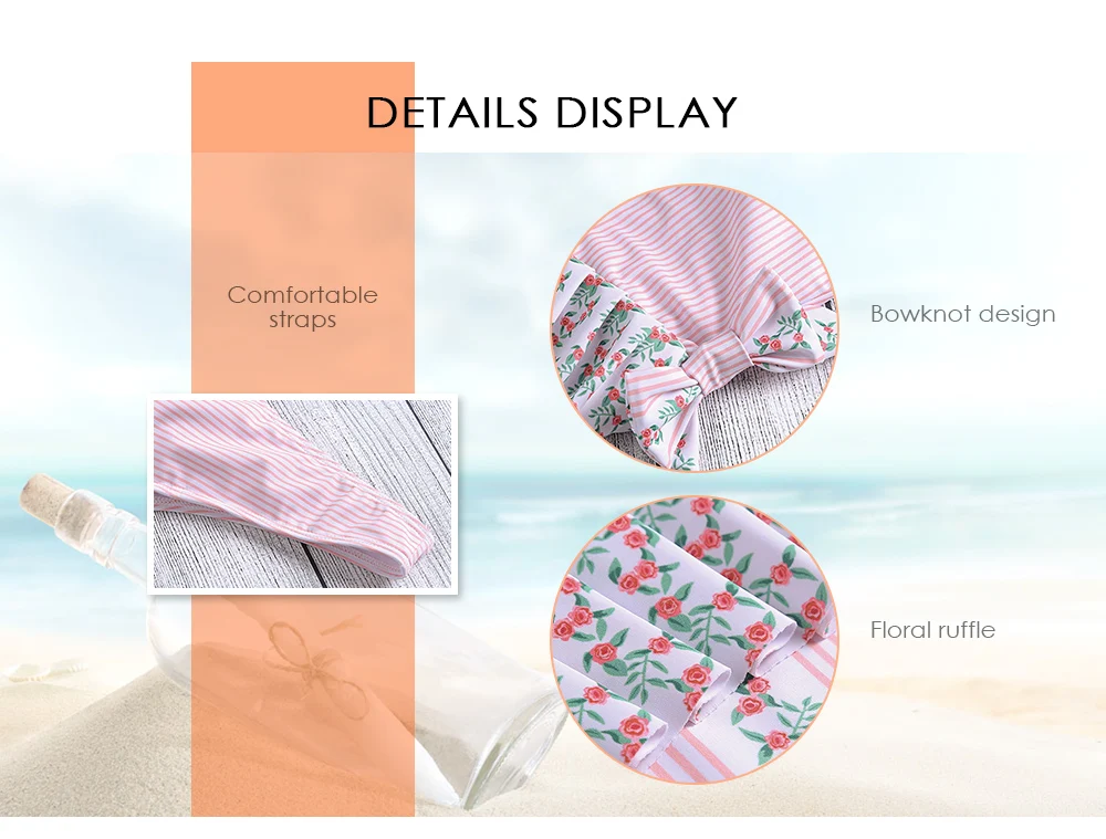 – Sweet element: the pink color is the romantic color and lovely small floral ruffle which will make you look pretty sweet. And the striped and floral print make this swimsuit more exquisite.