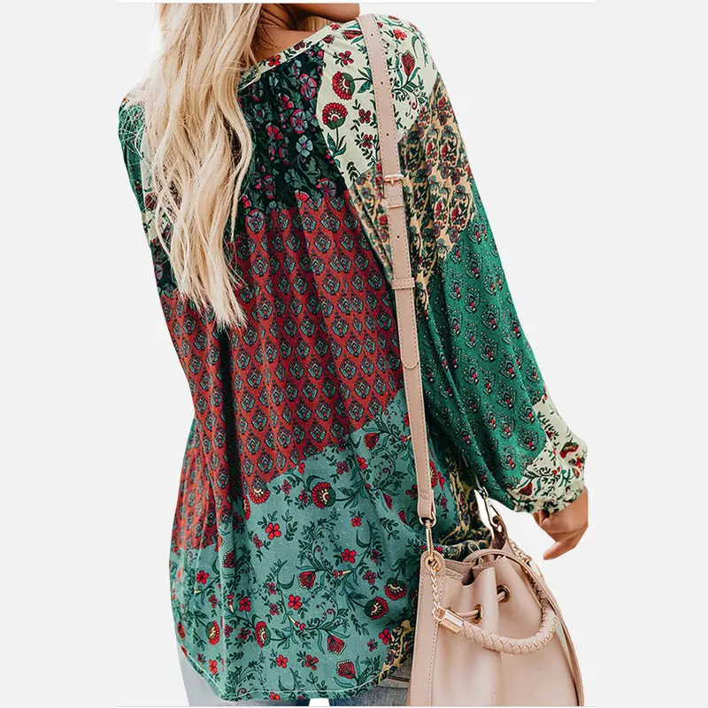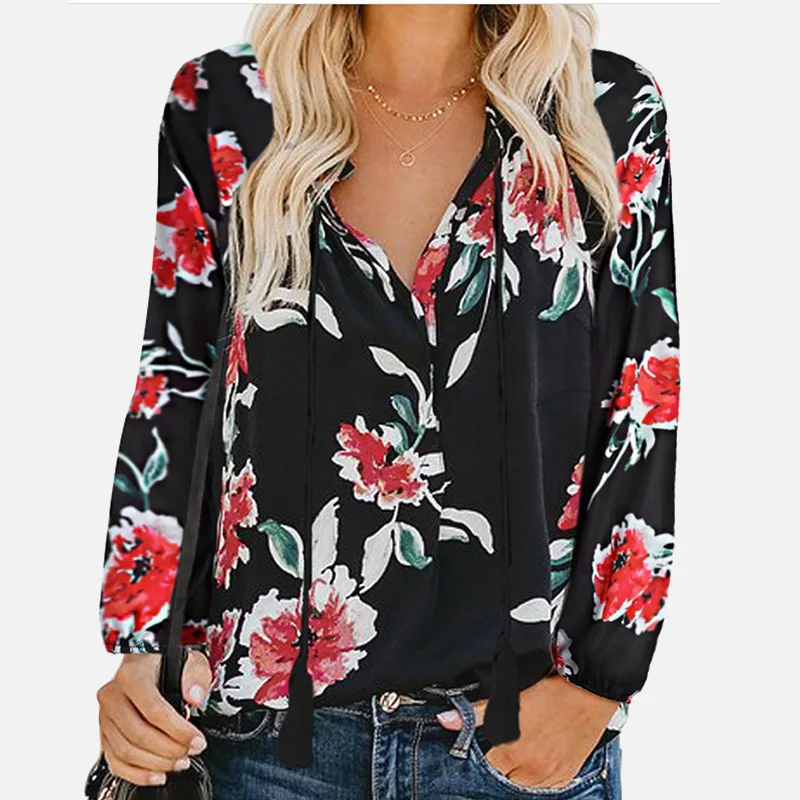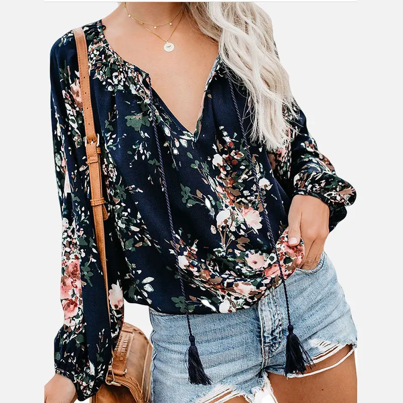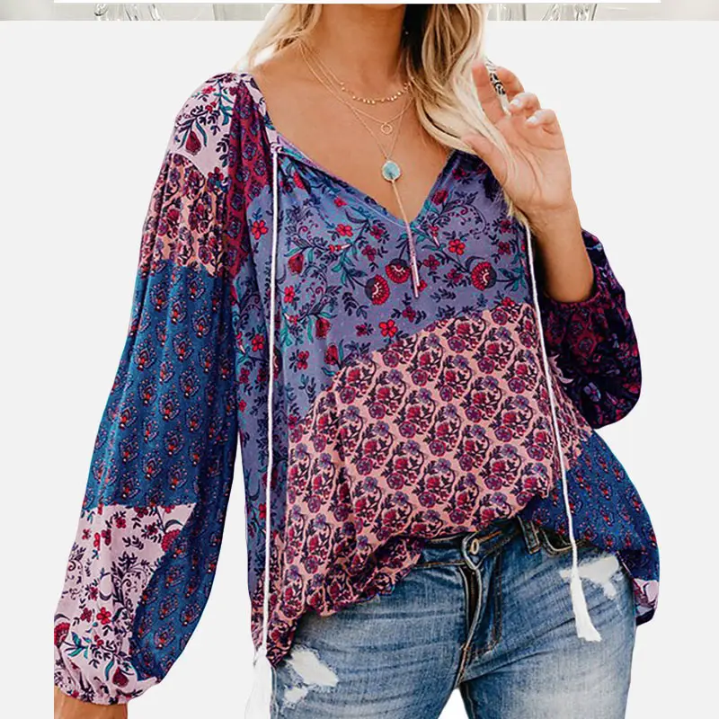 FREE SHIPPING Women Shirt Floral Print V-neck Vintage Blouse Long Lantern Sleeve Drawstring Boho Female 2019 Autumn Shirts Plus Size Clothing JKP2749