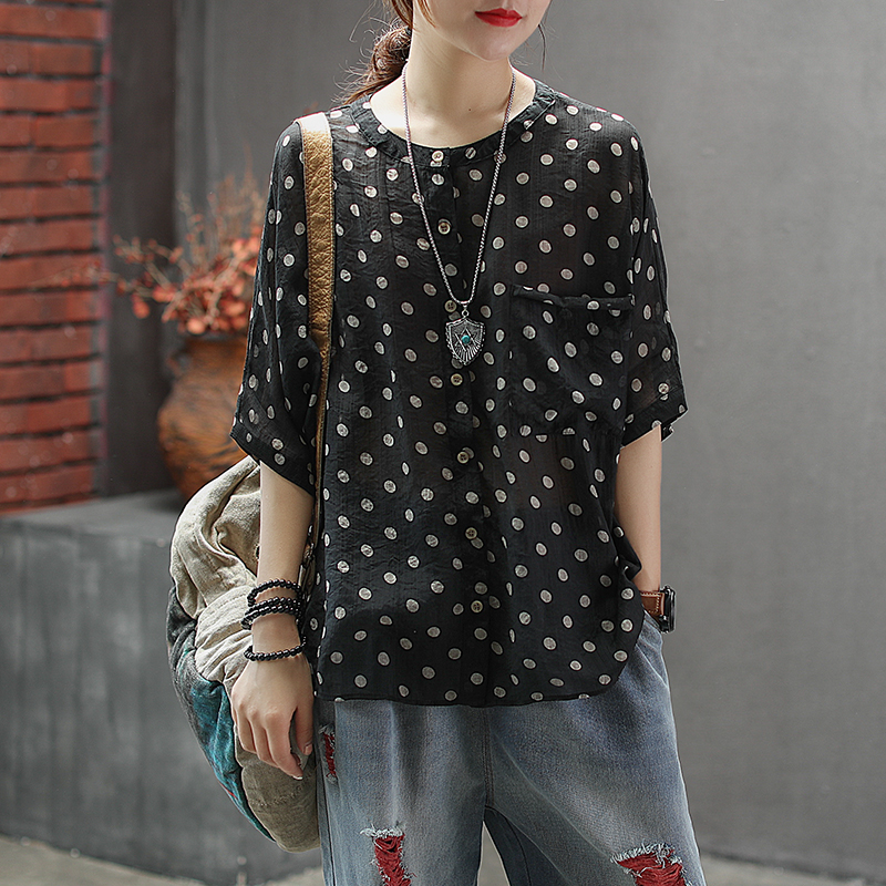FREE SHIPPING Women Shirts Polka Dot Tops Large Size Loose Blouse With Pockets Female Casual Summer Middle Sleeve O Neck Pea Printed Shirts JKP2765
