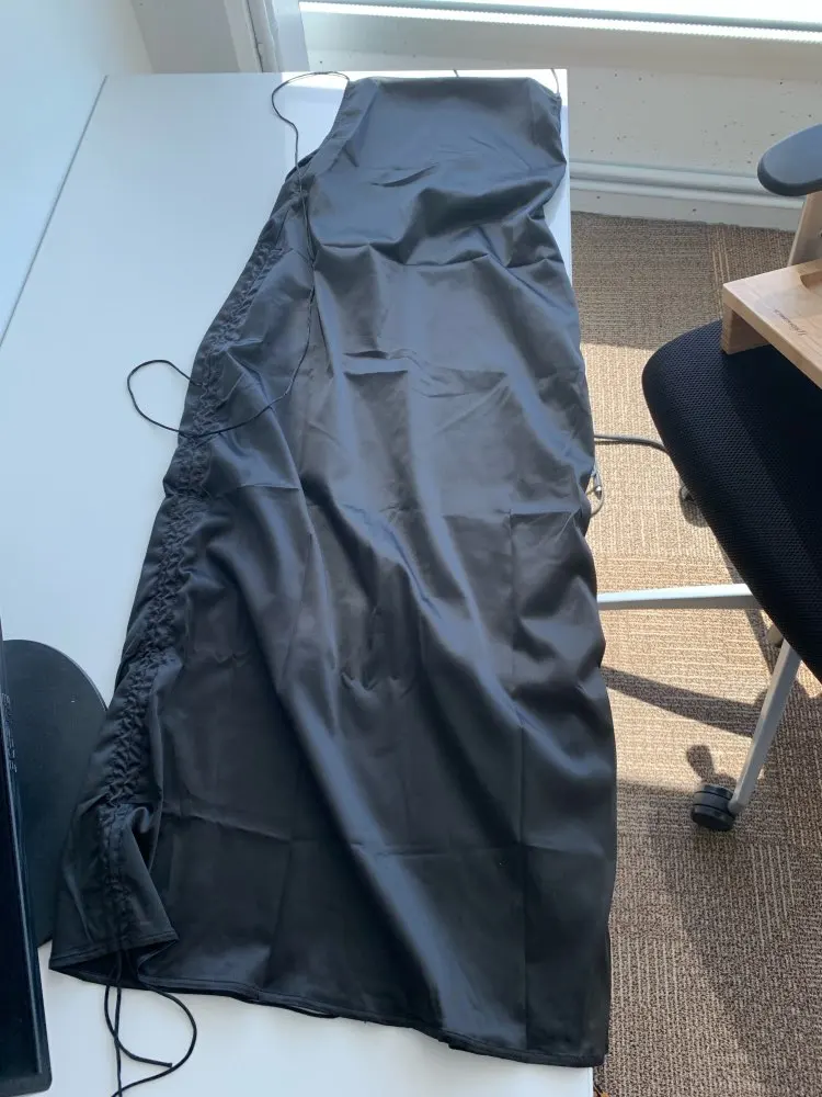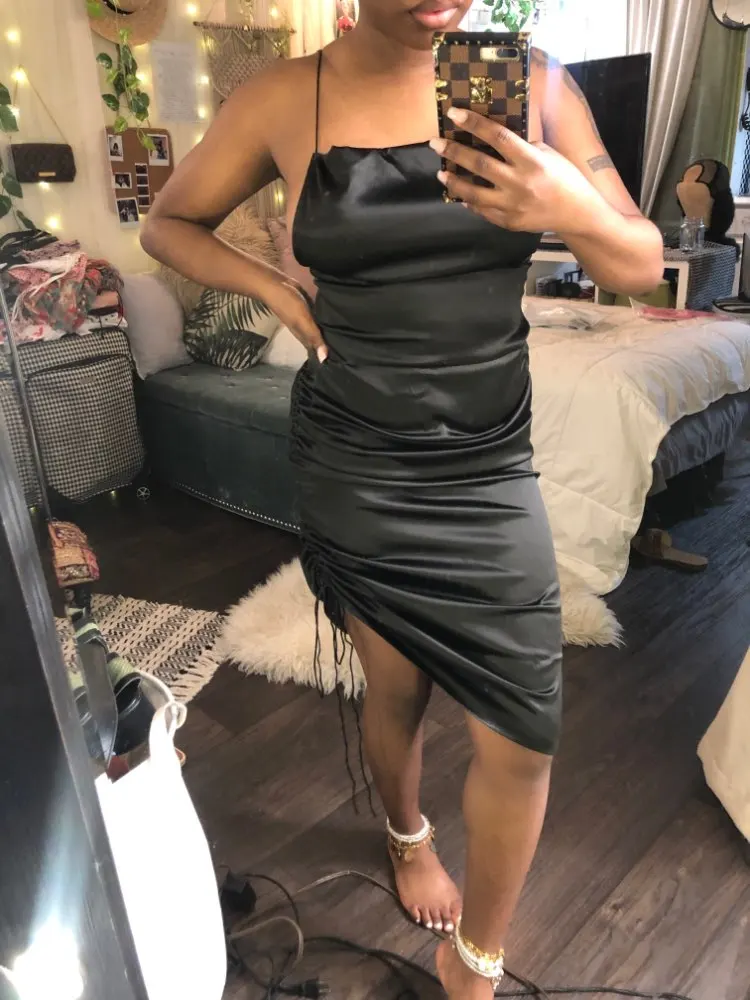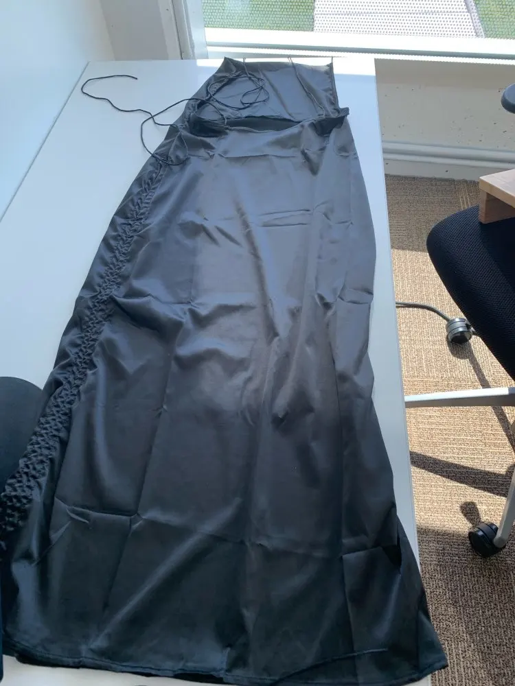 2week shipment to USA. Can be worn in multiple ways. Long or short. Great fabric for the price. It not silk nor satin, it’s more of an elastic satin fabric. Great great cant wait to style it. My last pic is how I will style it.
