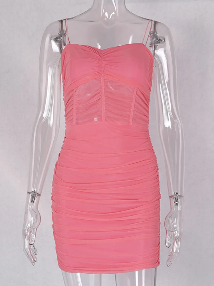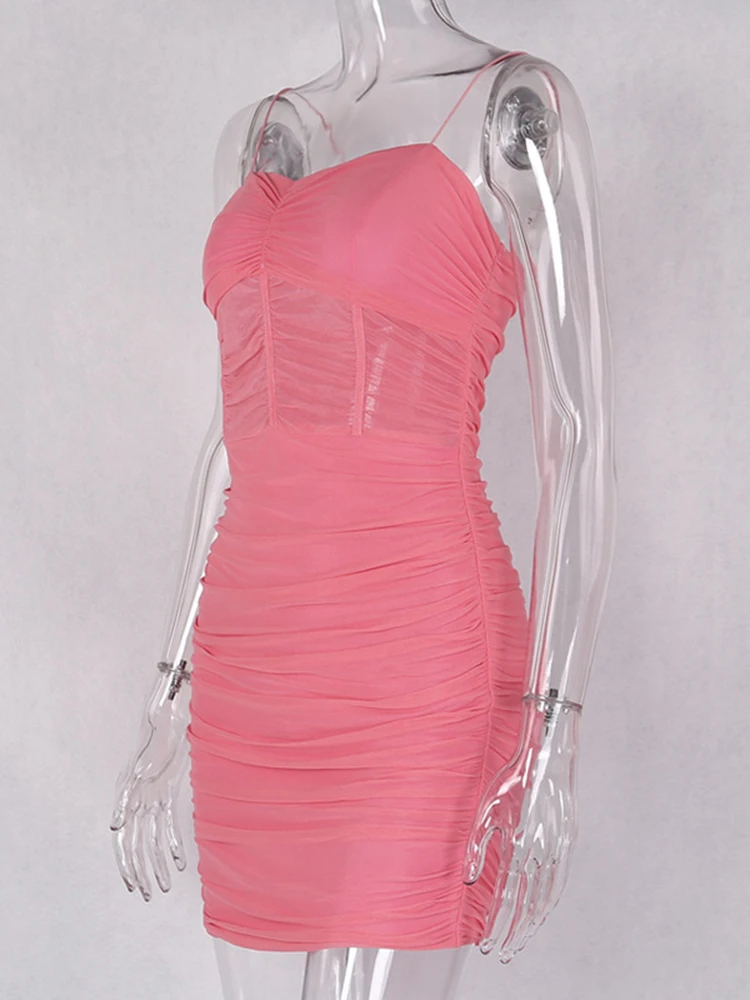 FREE SHIPPING Women Spaghetti Straps Slim Fit Mesh Ruched Dress JKP3199