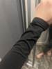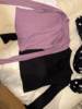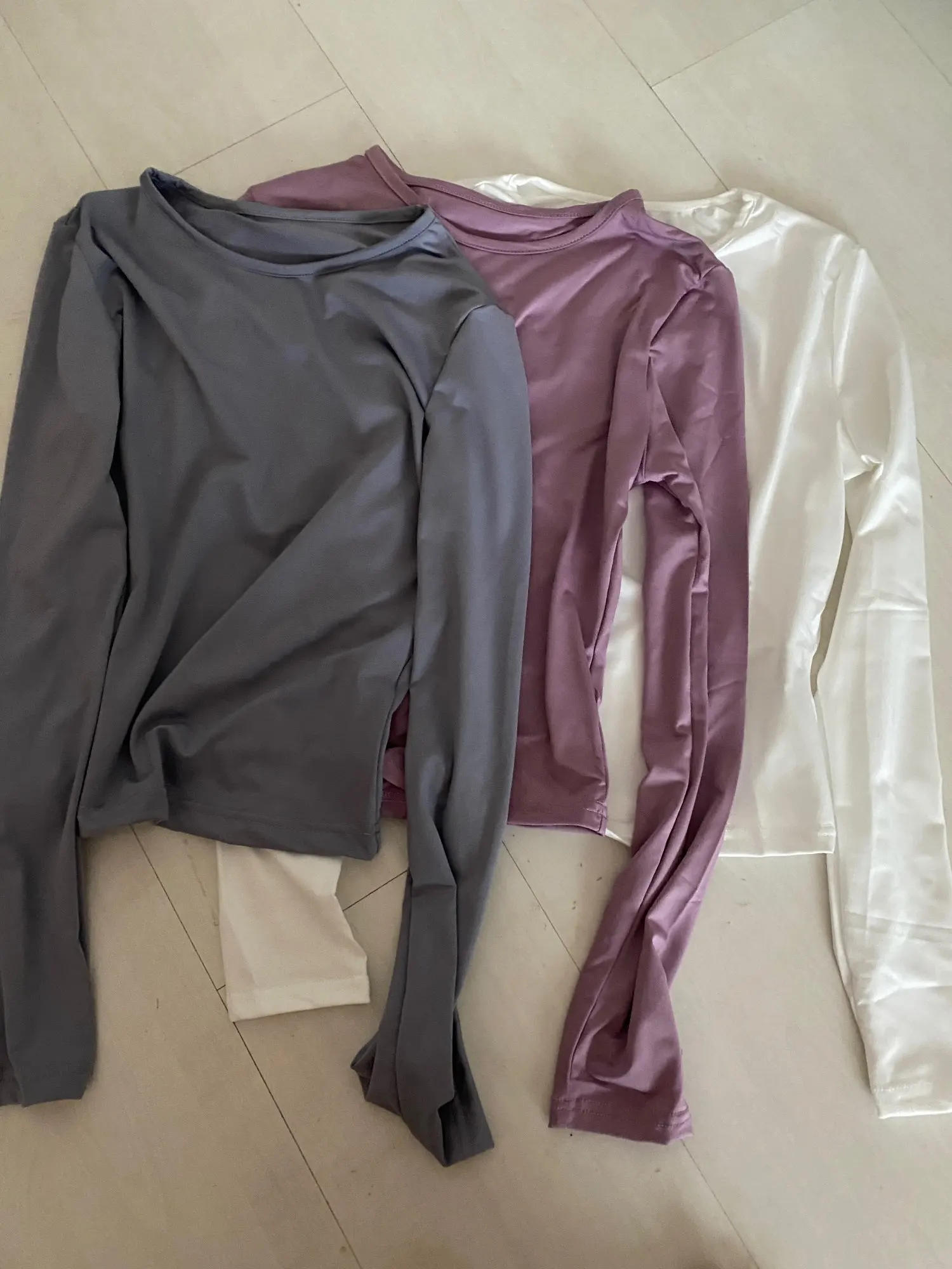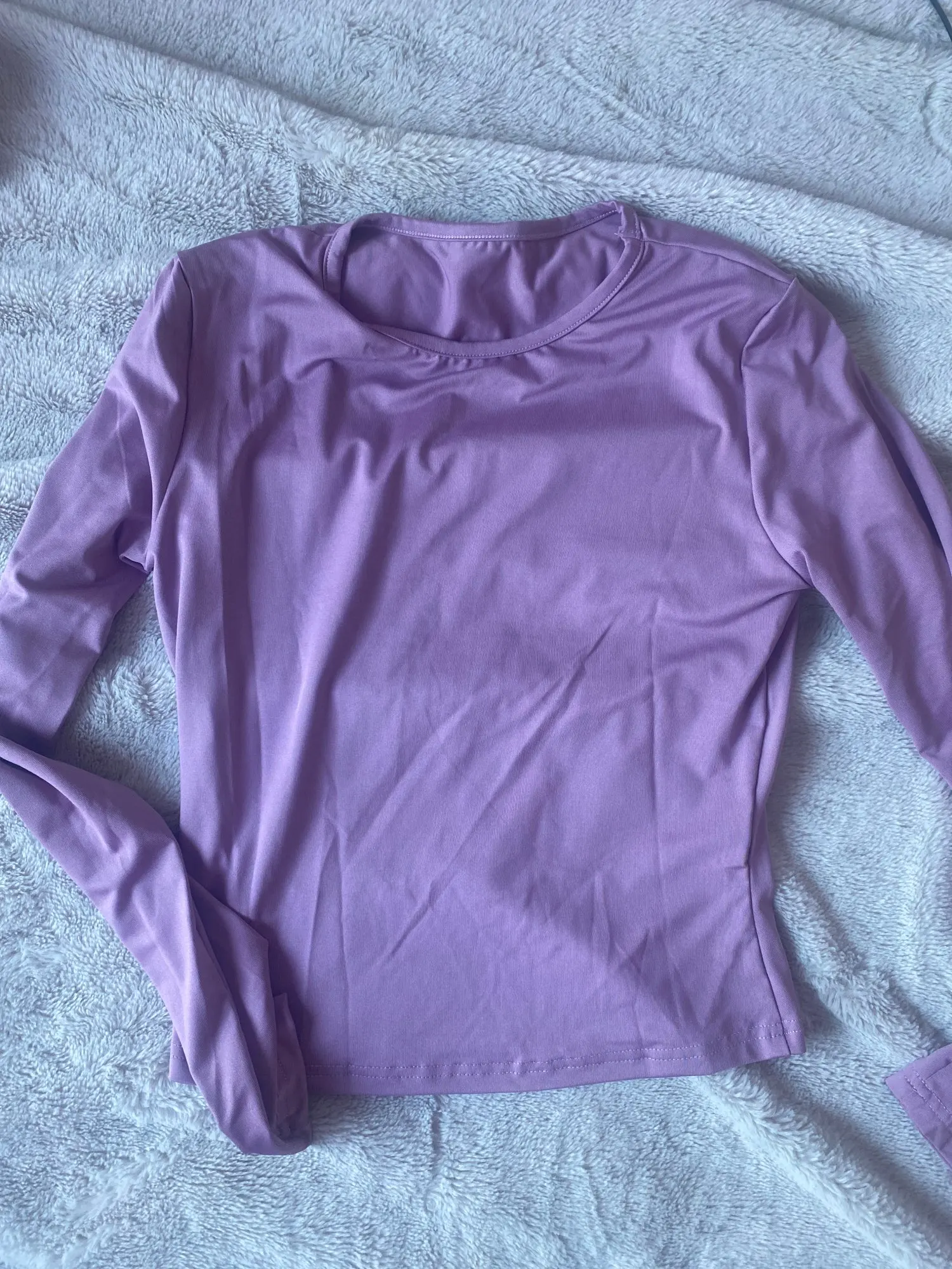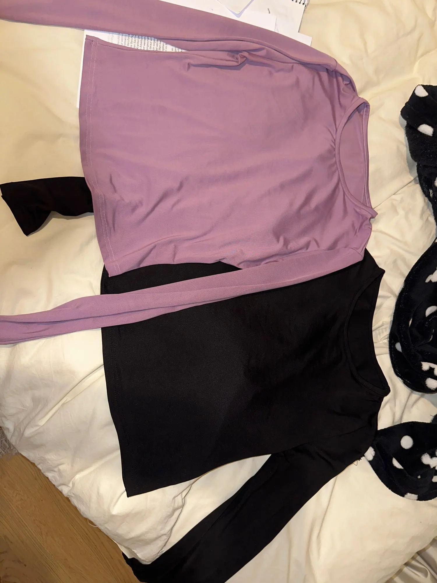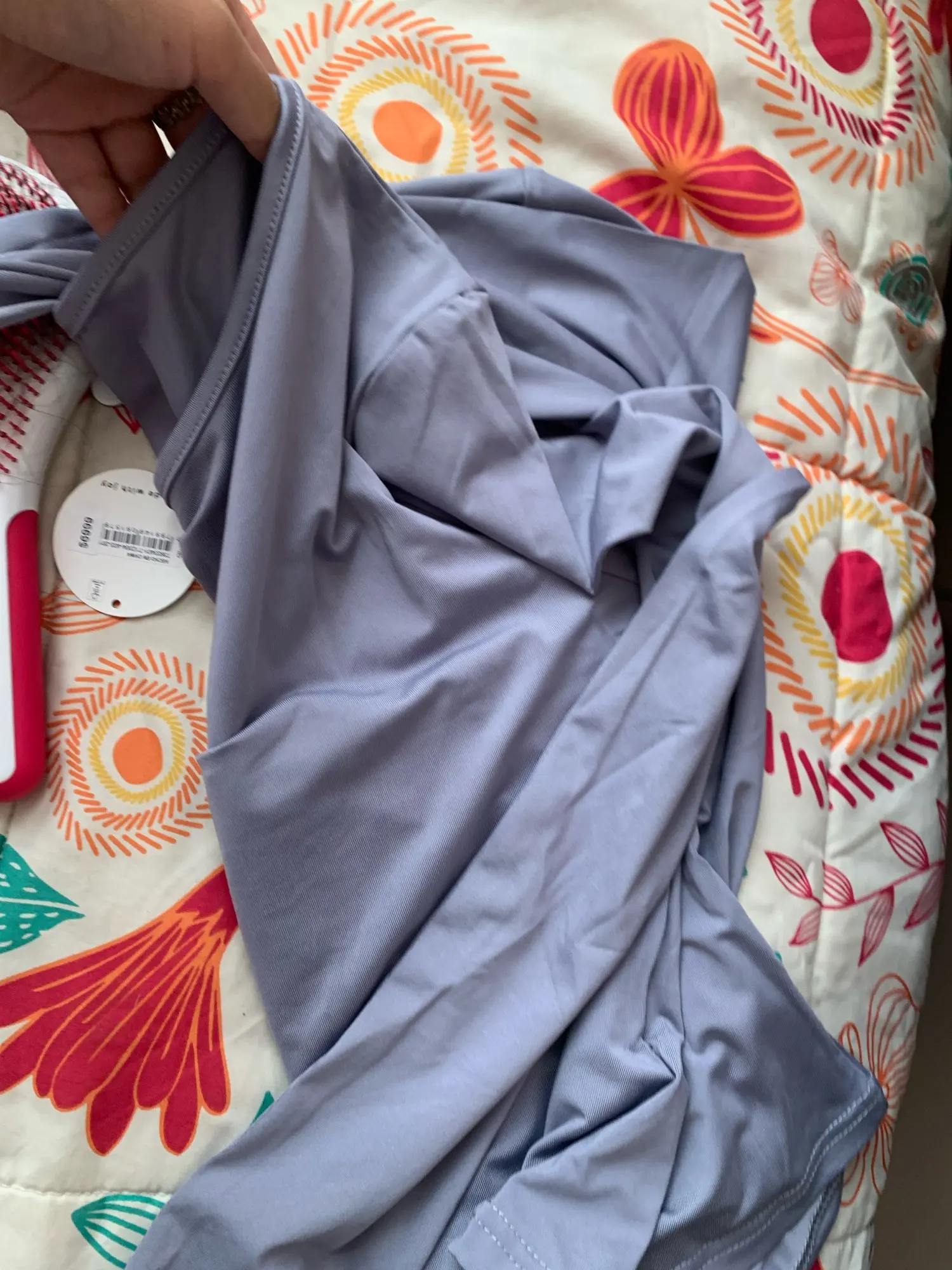 Material feels nice on skin but i wanted to scratch my arm over the shirt and it left black color on my nailpolish on nails, but fits okay and for the price is okay. Black shirt is longer on the body than the ‘pink’ one.