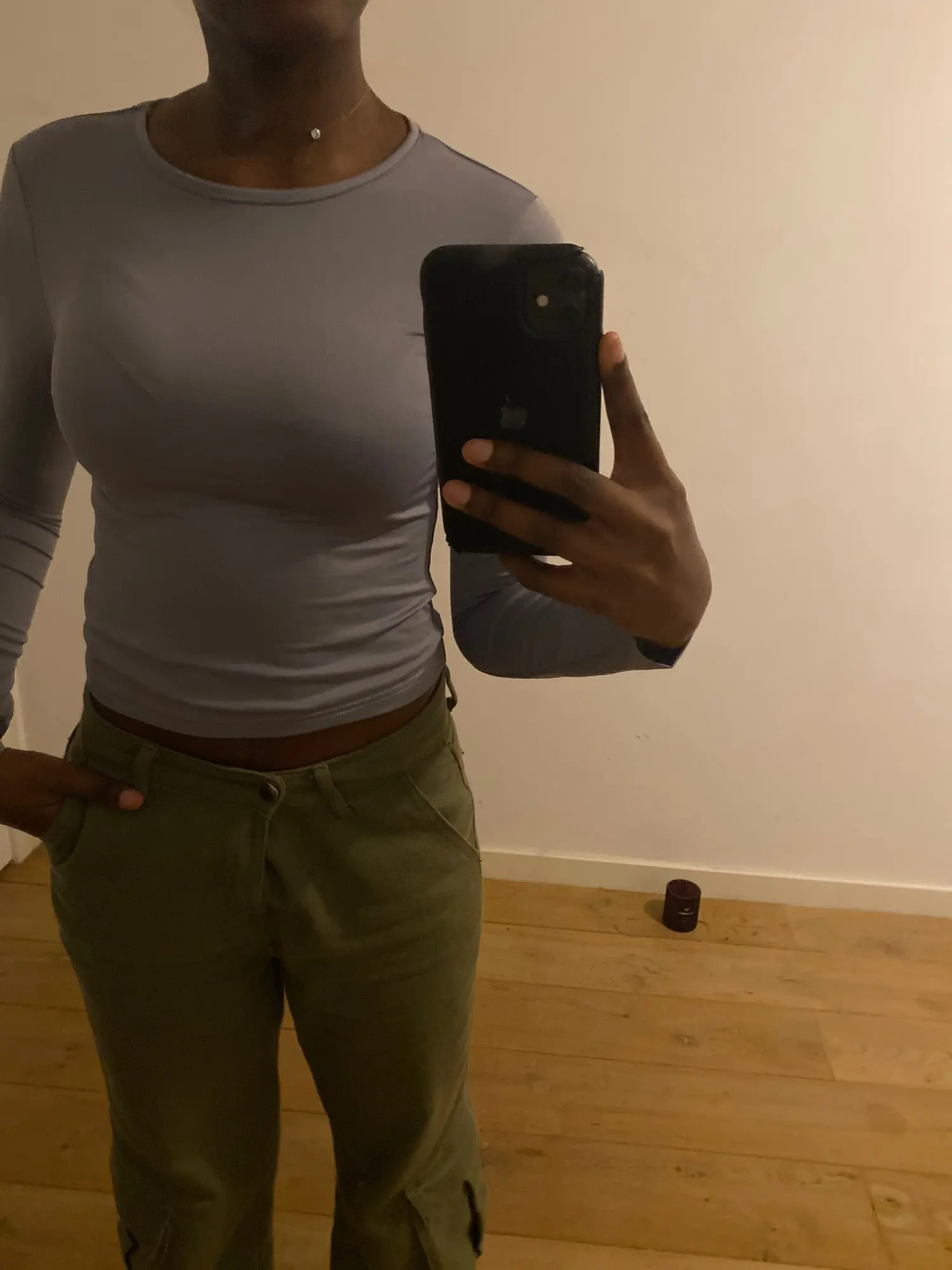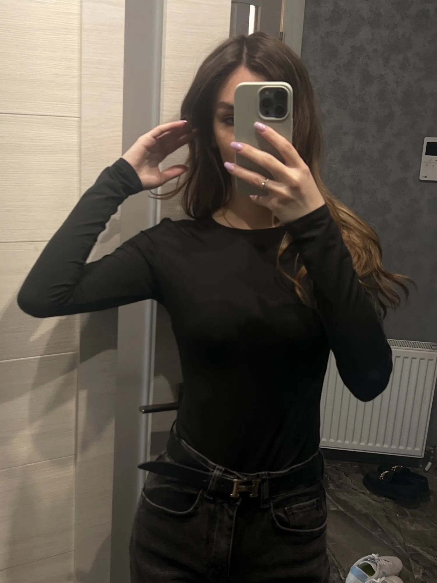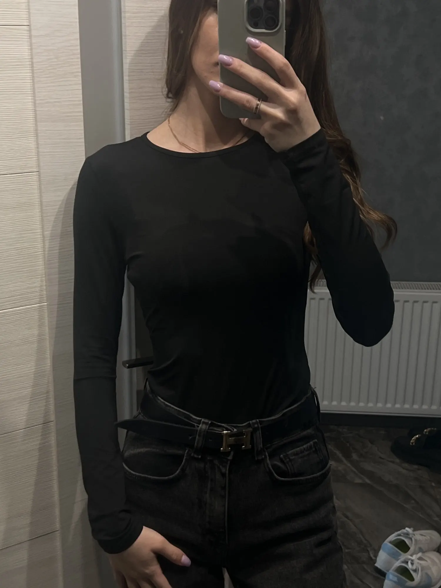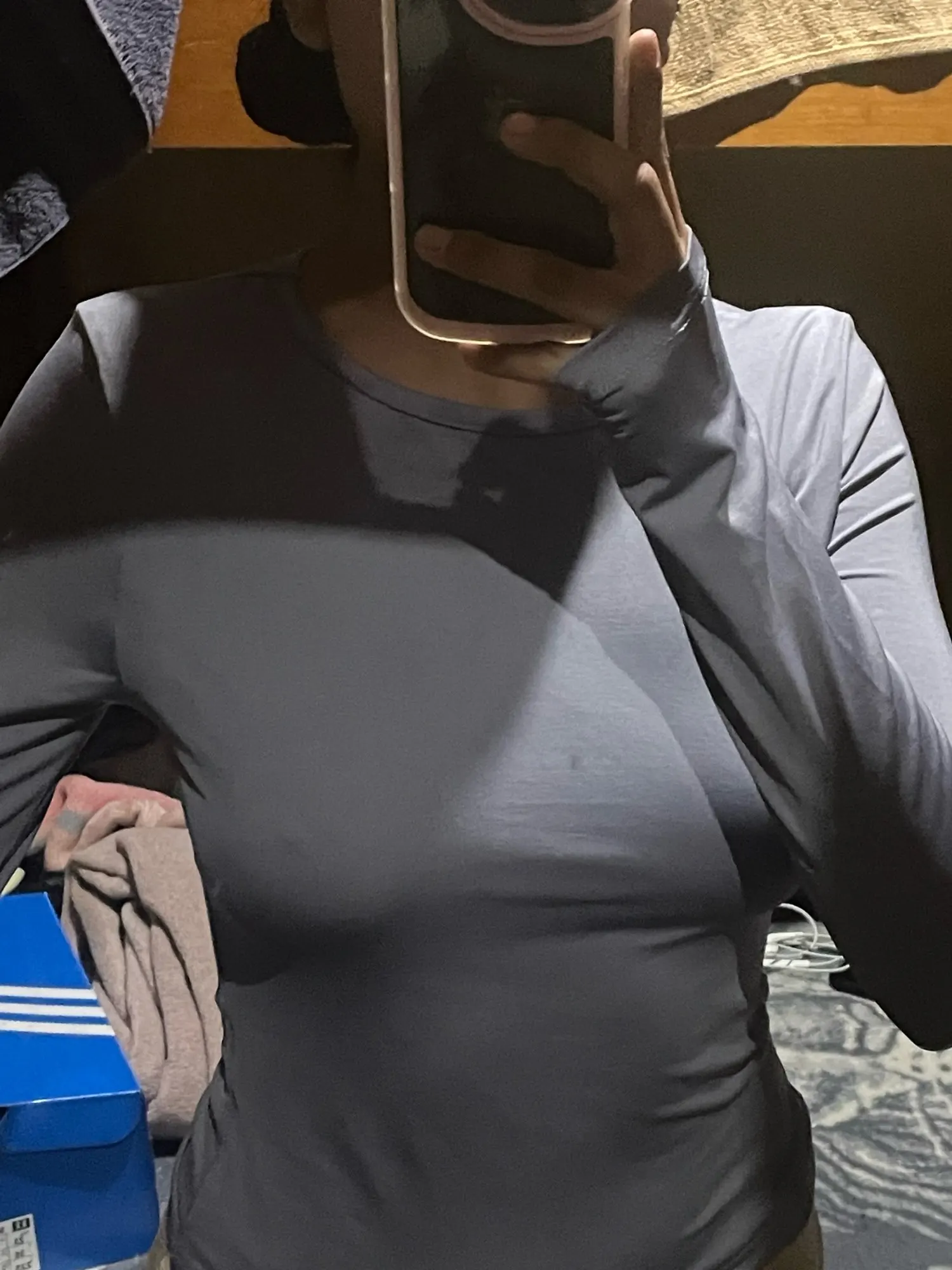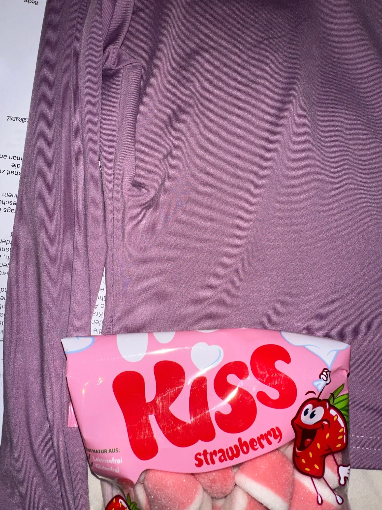 Material feels nice on skin but i wanted to scratch my arm over the shirt and it left black color on my nailpolish on nails, but fits okay and for the price is okay. Black shirt is longer on the body than the ‘pink’ one.