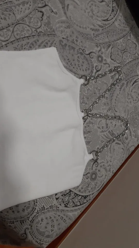 BEAUTIFUL TOP! fabric is soft and elastic, fit well around body! The chains are lightweight , a really wonderful piece