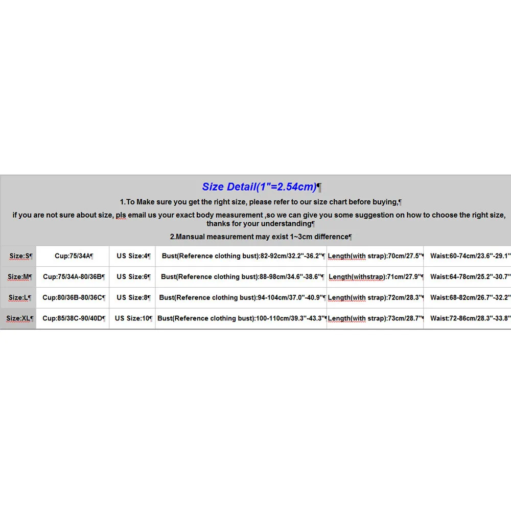 Size Detail(1″=2.54cm) 1.To Make sure you get the right size, please refer to our size chart before buying, if you are not sure about size, pls email us your exact body measurement ,so we can give you some suggestion on how to choose the right size, thanks for your understanding 2.Mansual measurement may exist 1~3cm difference |