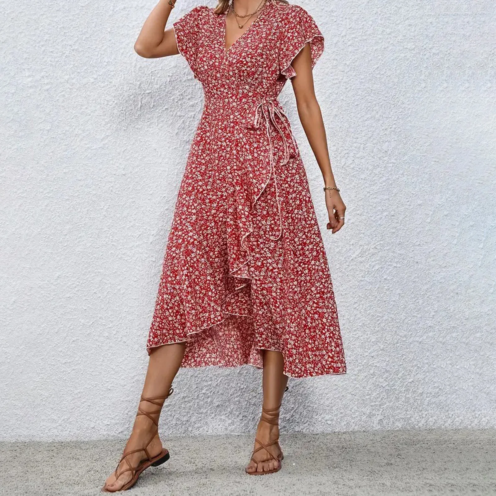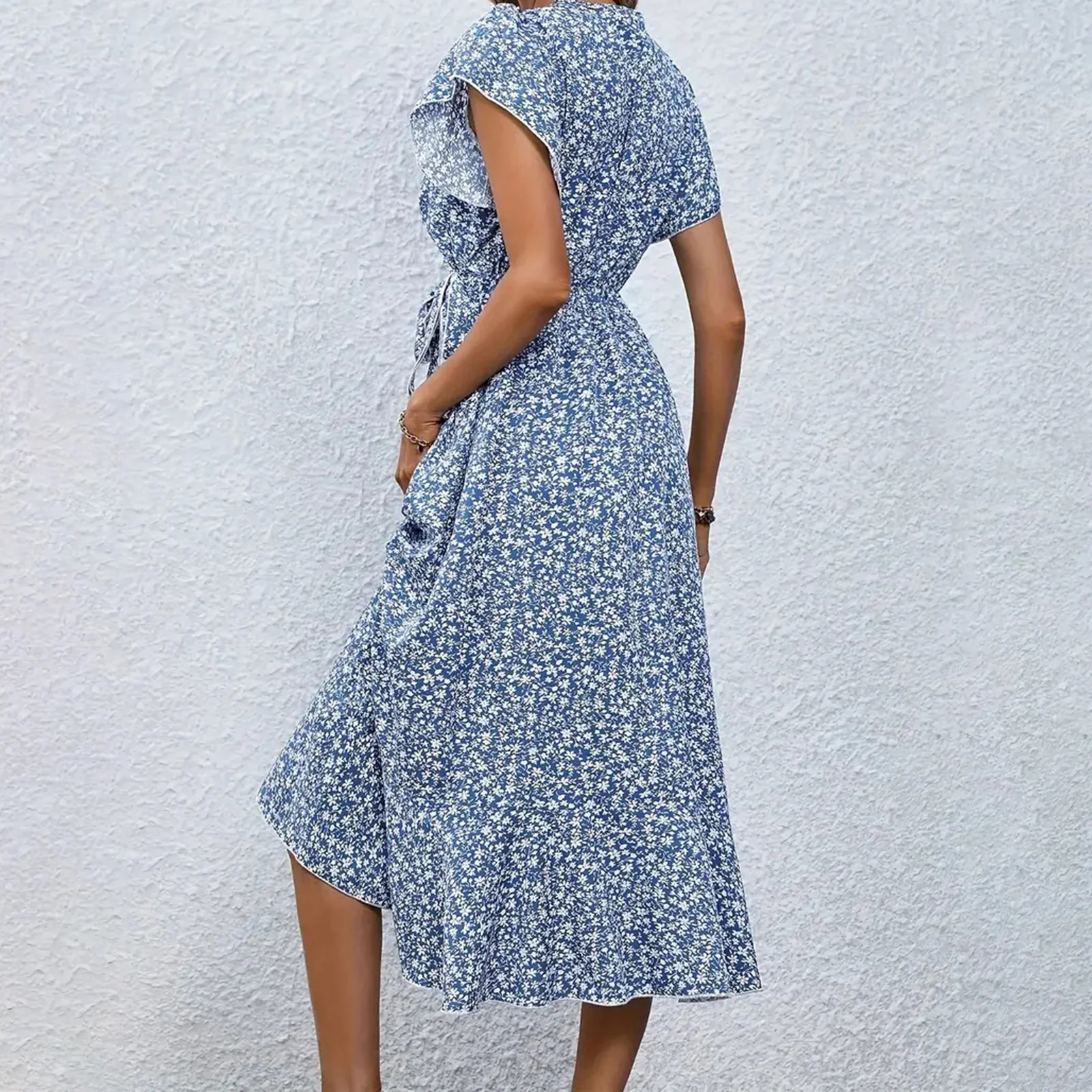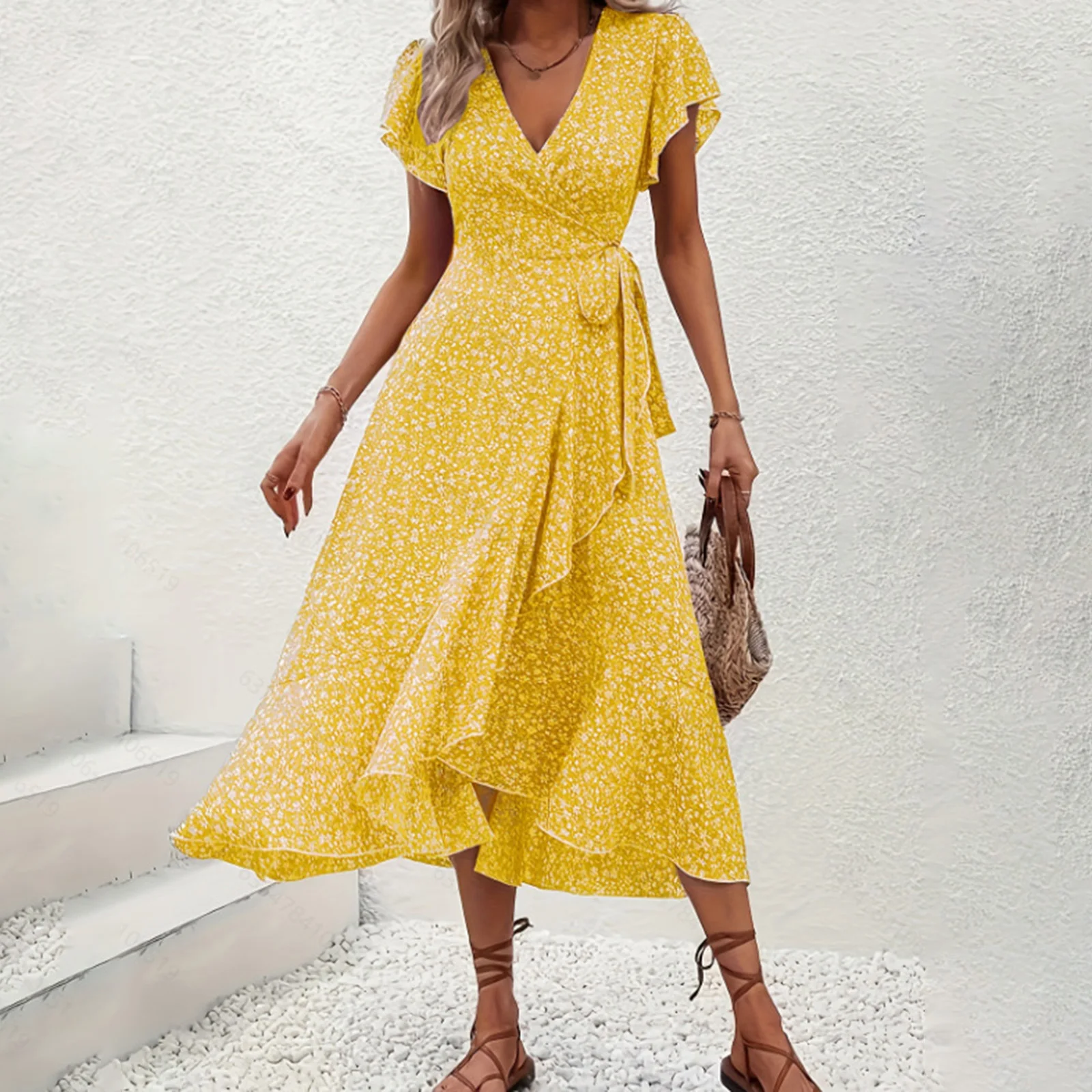 FREE SHIPPING Women Summer Ruffle Wrap Midi Dress Floral Printed JKP7392