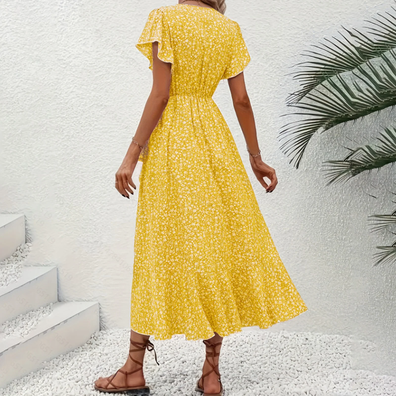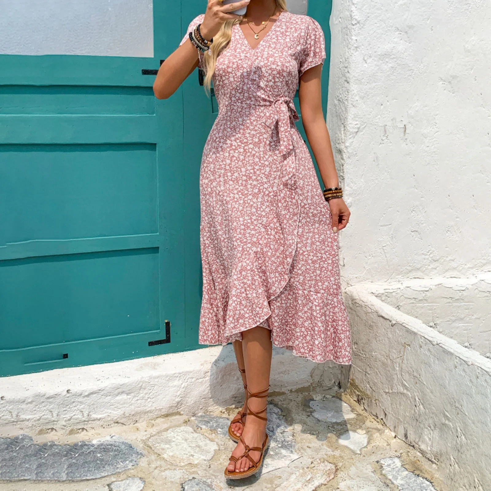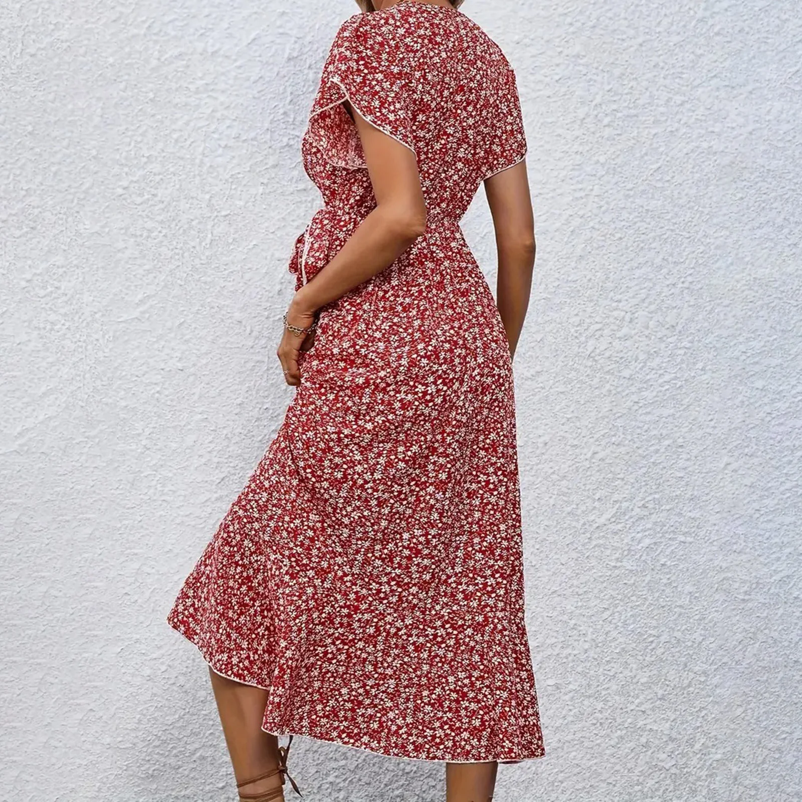 FREE SHIPPING Women Summer Ruffle Wrap Midi Dress Floral Printed JKP7392