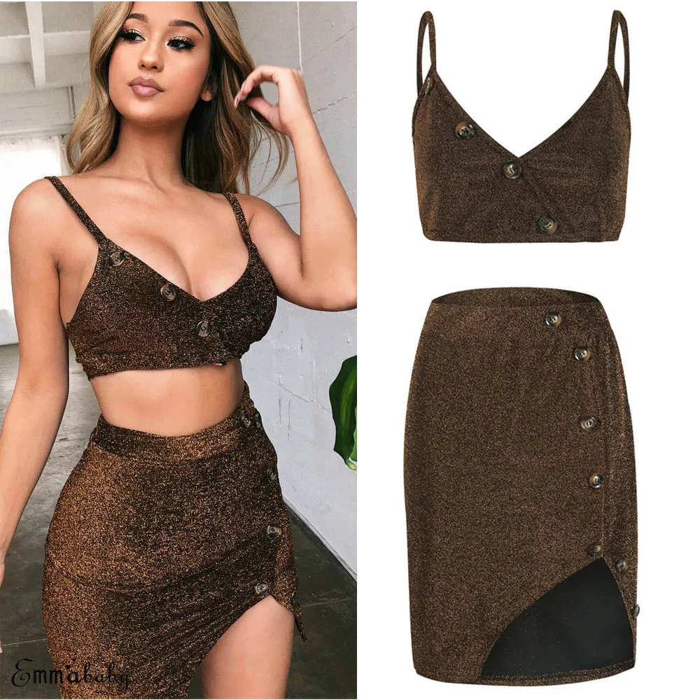 FREE SHIPPING Women Two Piece Bodycon Sequin Crop Top Split Skirt Set jkp3136