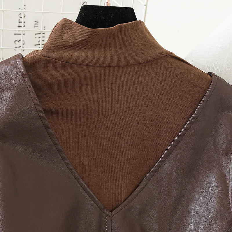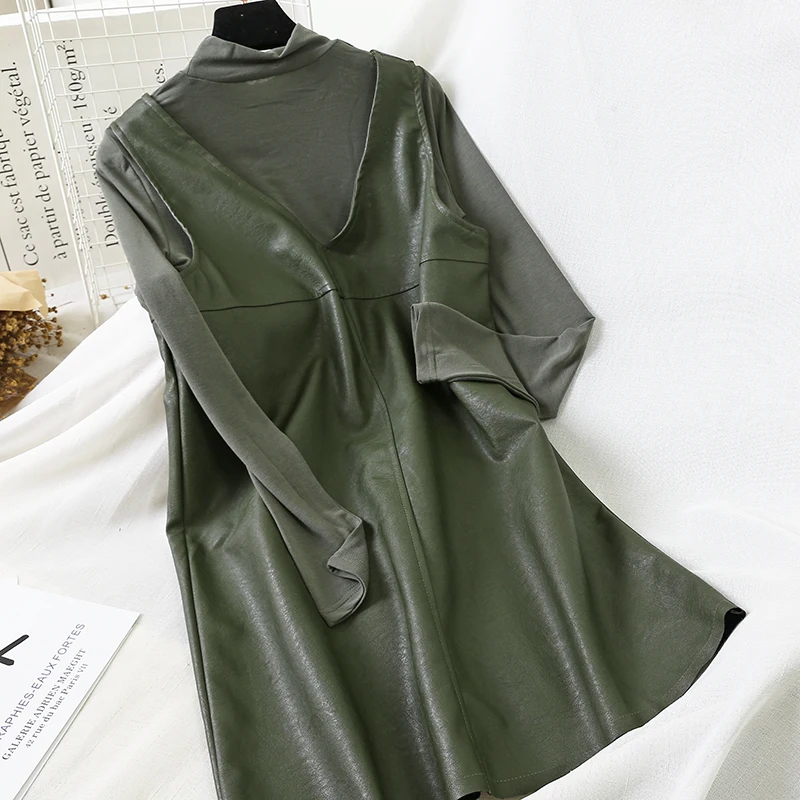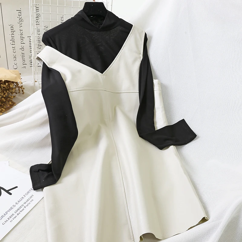 FREE SHIPPING Women Two Piece Outfits Turtleneck Long Sleeve Slim Shirt Pu Loose Midi Dress JKP3466