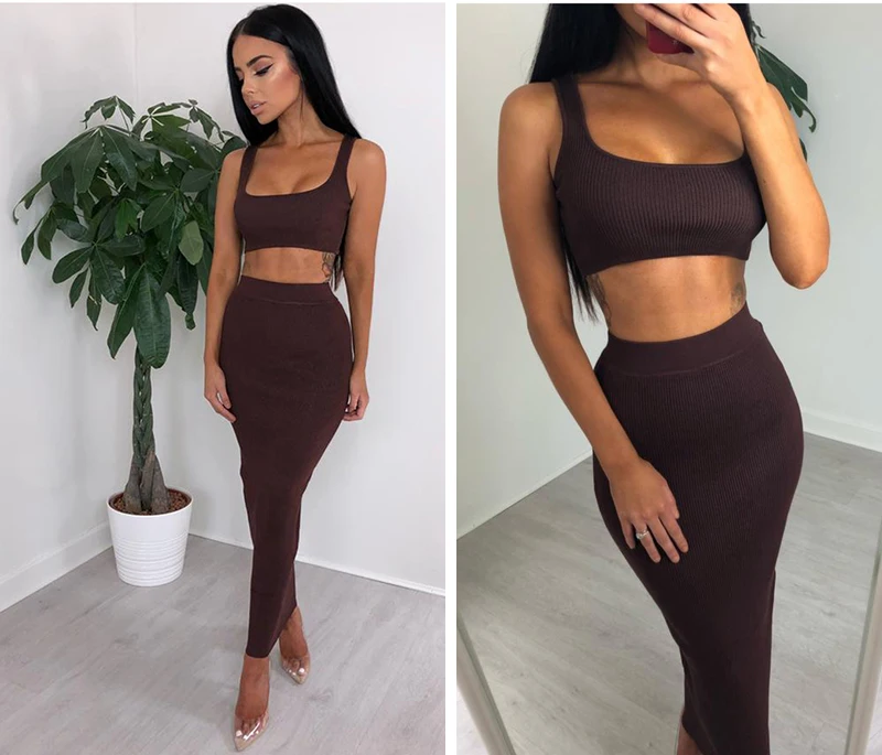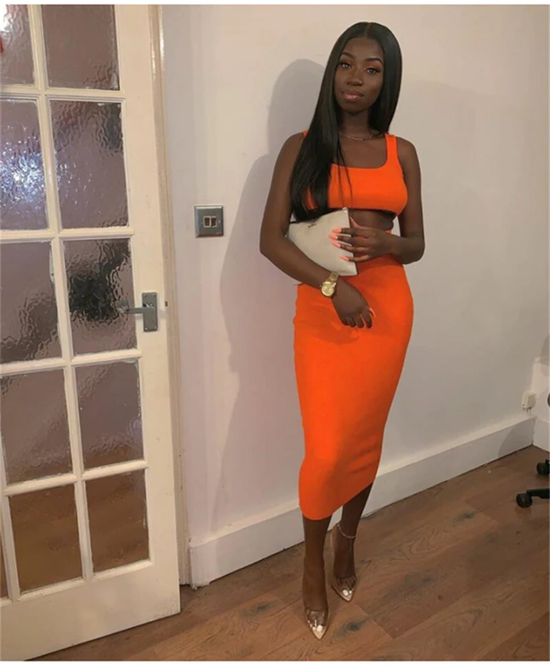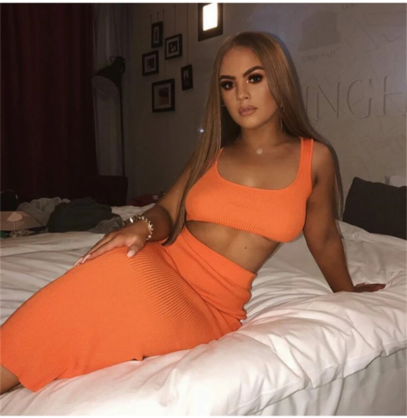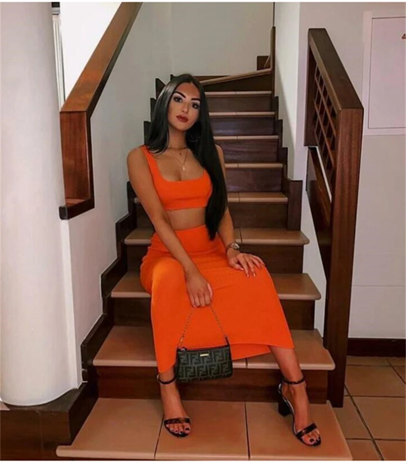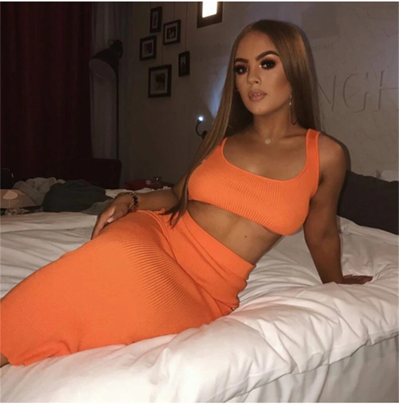The 2 piece set is great for the summer. The skirt is a little thicker than the slinky material but it’s still really nice. The top is a Lil big but I love the set. The color is waaay more vibrant than these pictures FYI. Truly bright Orange