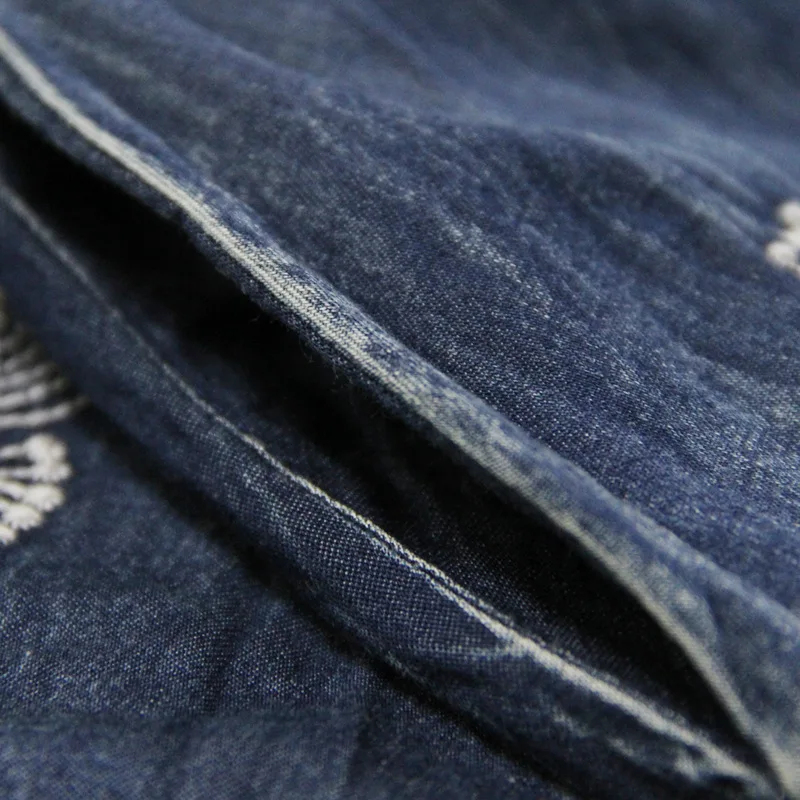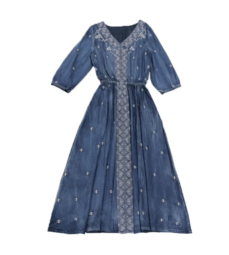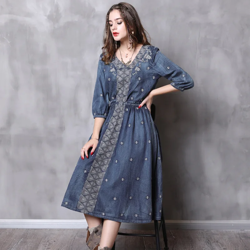 Vintage Denim Dress 2018 Women V-neck Half Sleeve Autumn New Elastic Waist A-line embroidery Cotton Midi Dresses