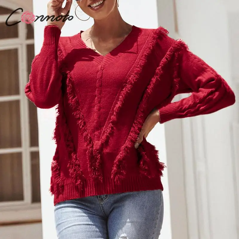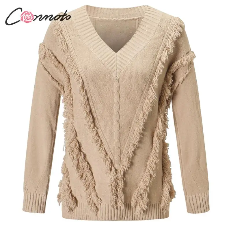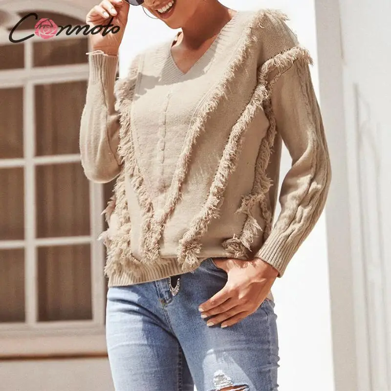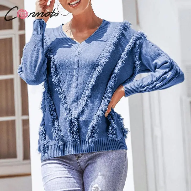 FREE SHIPPING Women V Neck Long Sleeve Knitted Tassel Pullovers JKP3687
