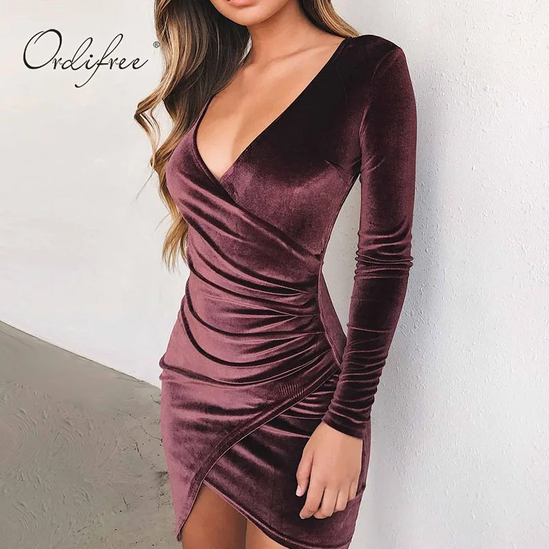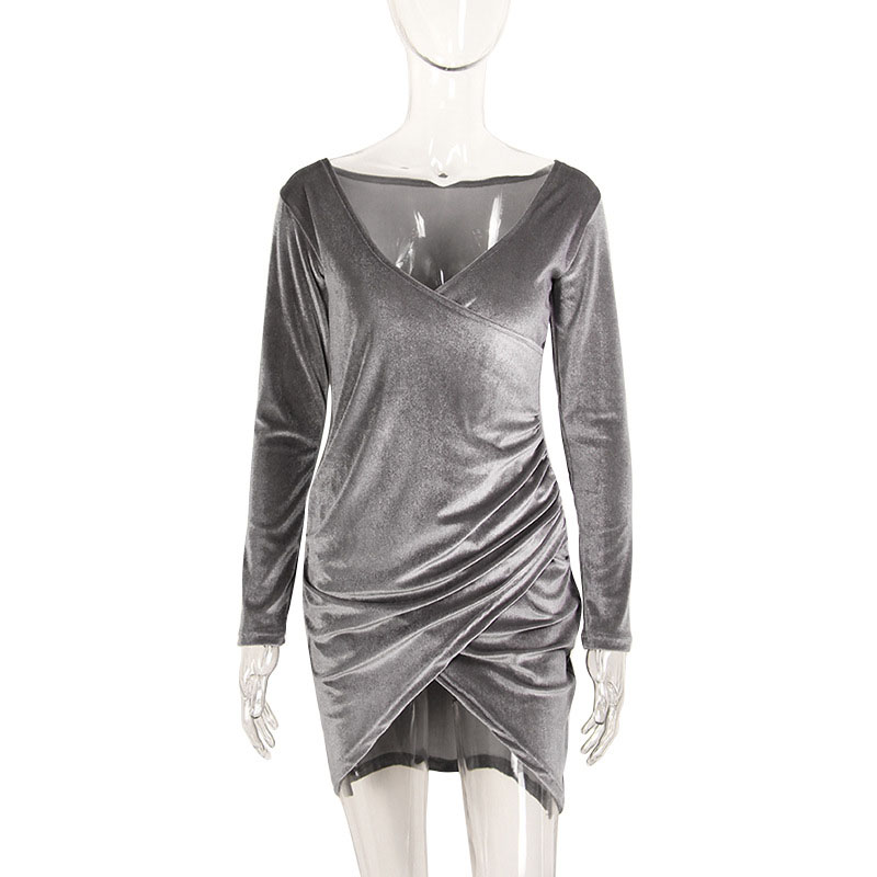 FREE SHIPPING Women Velvet Long Sleeve V Neck Sexy Bodycon Dress JKP1076