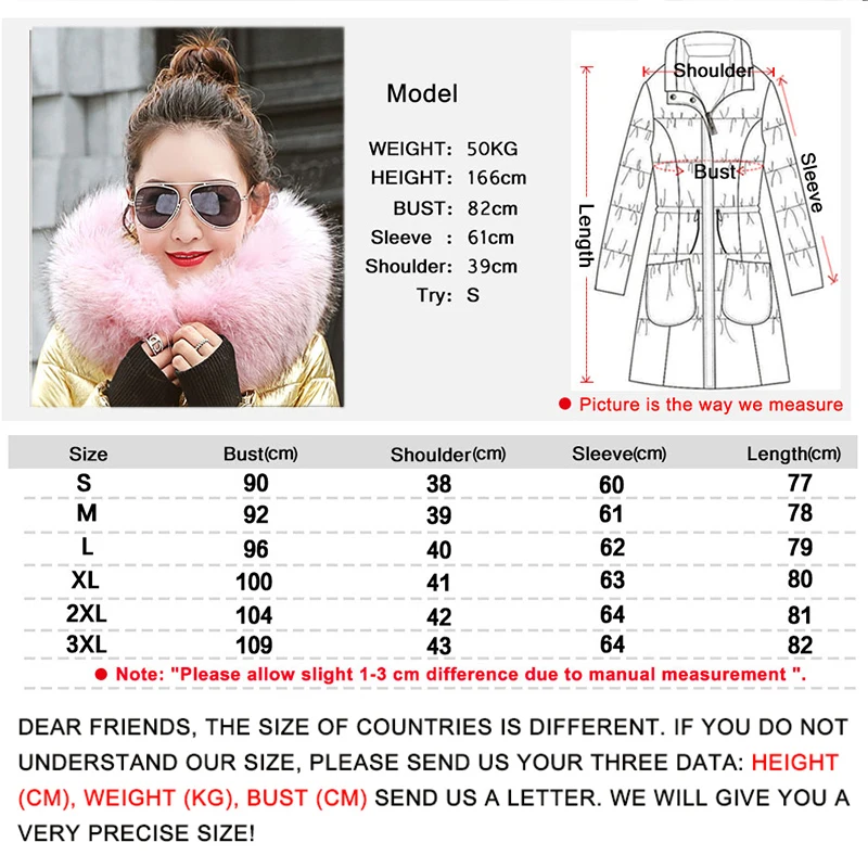 THE coat is beautiful! Perfect packaging. Ordered the XXXL afraid tight actually was a little off the abdomen, but is perfect because Use in snow and put more clothing underneath. 1,75 cm height and 79 kg, super comfortable to around. Super attentive and delivery pro Brasil in 15 days. Buy more 2 coats so good that is.