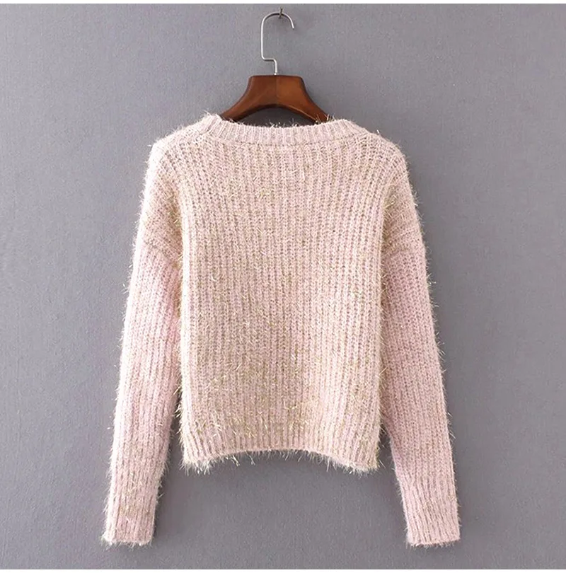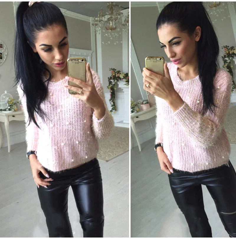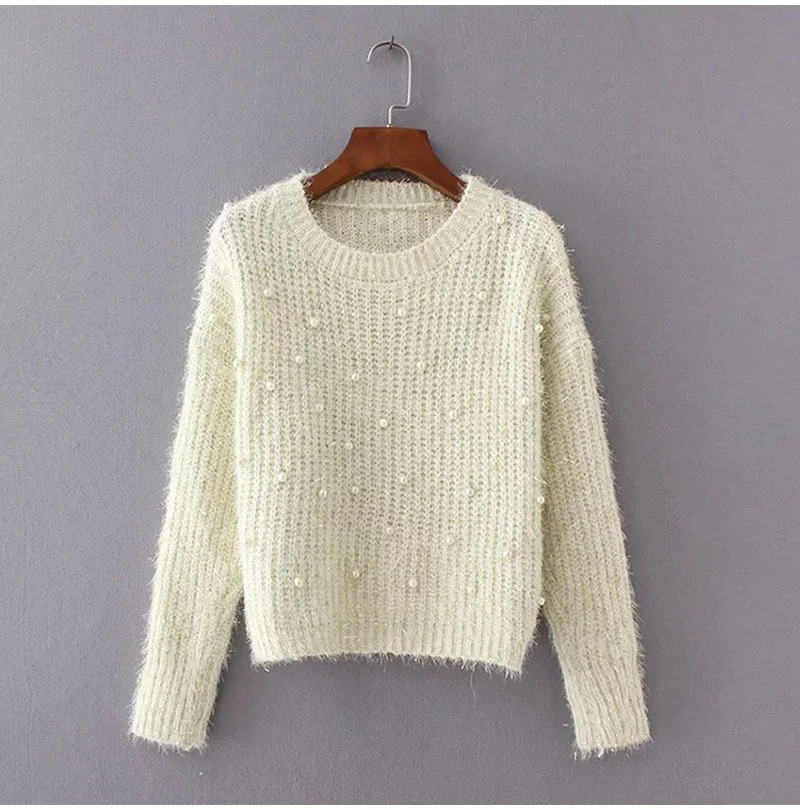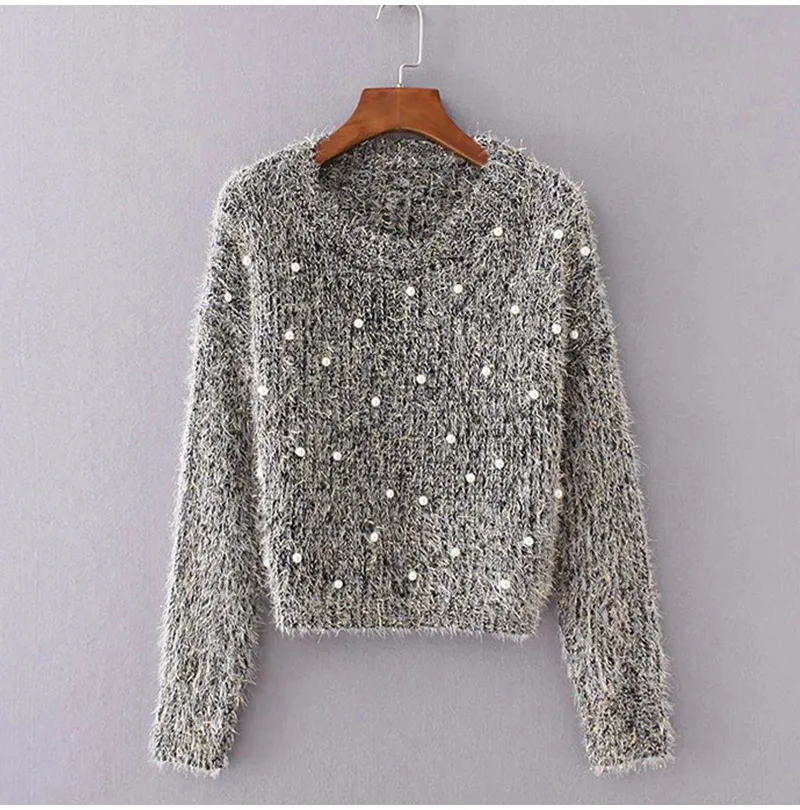 FREE SHIPPING Women’s Beading Pearl Fluffy Sweater Crop Top O neck Knitted Slim Pullover 2018 Autumn Winter Warm Fashion Casual Woman Sweaters JKP2247
