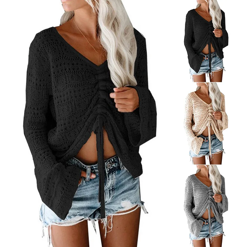 FREE SHIPPING Women’s Casual Hollow V-Neck Flare Sleeve Knitting Sweater JKP3218