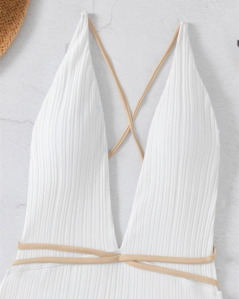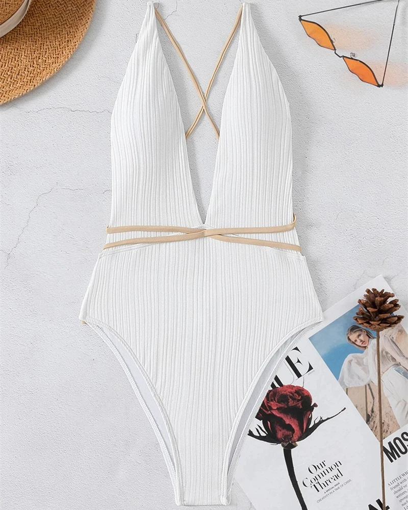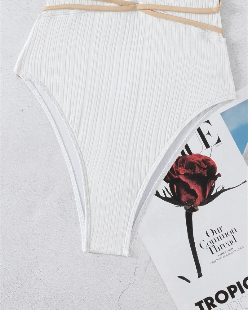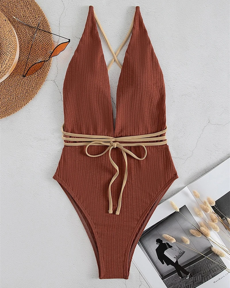 FREE SHIPPING Women’s Simple Ribbed Lace Up Bikini One Piece Swimsuit Brazilian Swimwear Monokini JKP6056