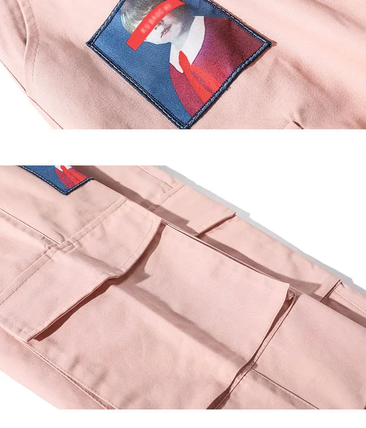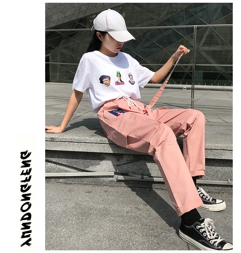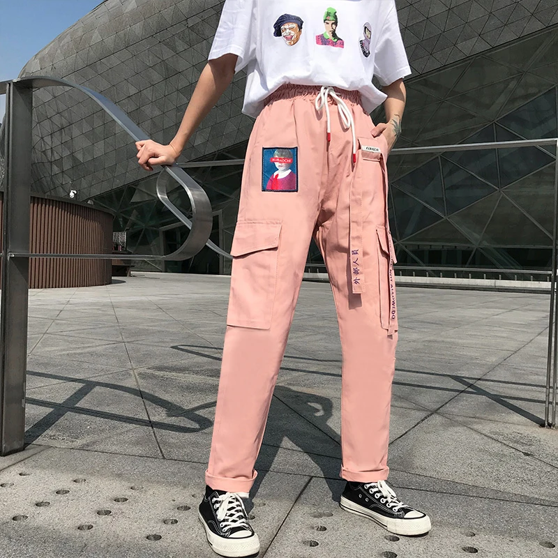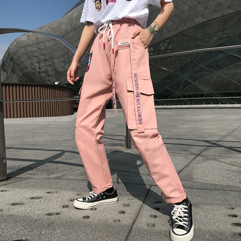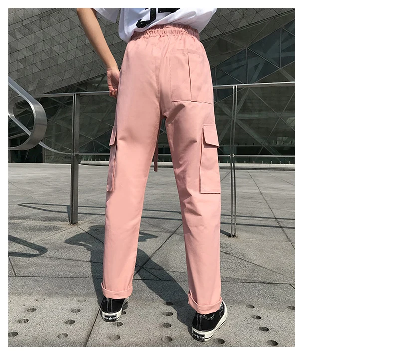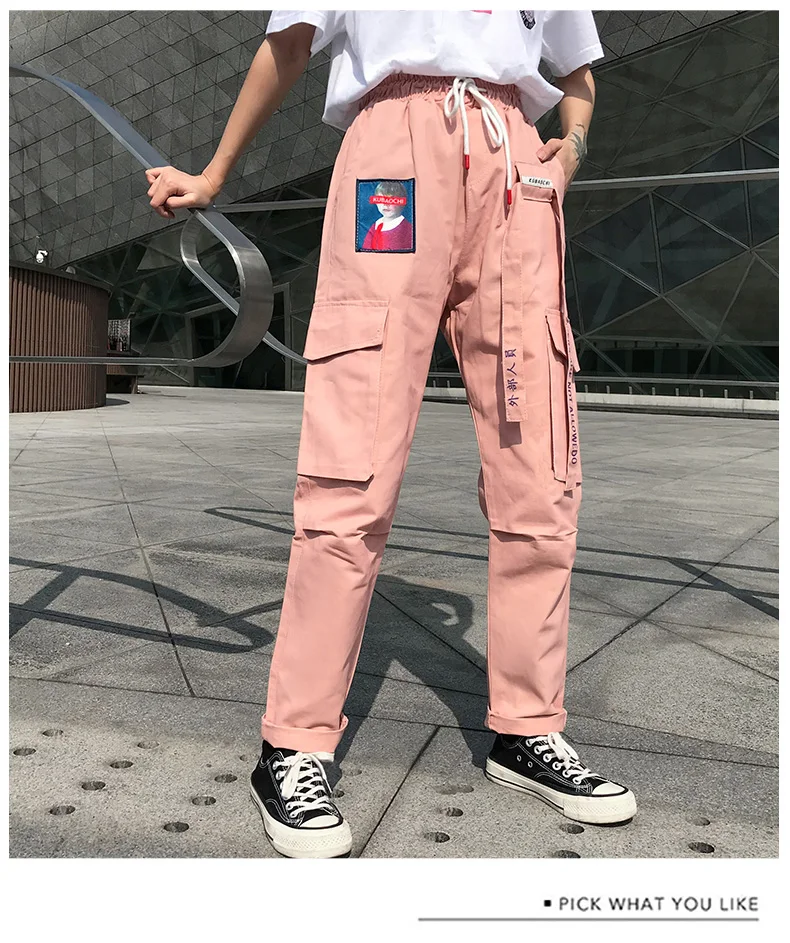 FREE SHIPPING Womens Street Outfit Cargo Pants Drawstring Waist Letters Printed Sweatpants Pink Big Pockets JKP1480