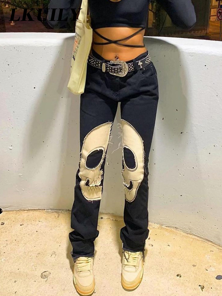 FREE SHIPPING Y2K Streetwear 90S Straight Jeans Vintage Skull Printed JKP5982